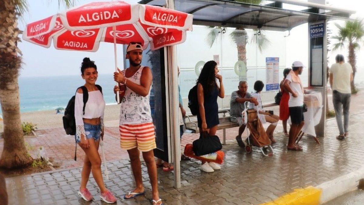 Bayram tatiliyle birlikte Antalya’ya akın eden tatilciler ve yabancı turistler, yağmur sürpriziyle karışlaştı.Hava sıcaklığının 30 derece olduğu Antalya’da, 10 günlük bayram tatilini değerlendirmek için dünyaca ünlü Konyaaltı plajına gelen yerli ve yabancı turistler deniz, kum ve güneş üçlüsünün keyfini çıkarırken aniden bastıran yağmurla neye uğradıklarını şaşırdı. İlk başta havanın kararmasına aldırış etmeyen tatilciler, ilerleyen dakikalarda aniden bastıran yağmurla birlikte eşyalarını toplamaya başladı. Yağmurun hızlanmasıyla birlikte bazı tatilciler plaj malzemelerini toplayıp araçlarına kaçıştı, bazıları ise güneşten korunmak için açtıkları şemsiyelerini bu sefer yağmurdan korunmak için açtı. Plajda yağmura aldırış etmeyen bazı turistler ise yağmur damlaları eşliğinde denizin keyfini çıkardı.Afyon’dan tatil için Antalya’ya gelen Yağmur Yılman, “Aniden gelen yağmur yüzünden eğlencemiz yarıda kaldı. O yüzden bir daha gelmeyi düşünüyoruz. Ama çok eğlendik. Bir günlüğüne geldik, o gün de yağmur yağdı şansımıza” dedi.Tatil için yine Antalya’yı seçen tatilcilerden gelen İpek Demir ise, “Çok sıcaktı, bunaldık, serinlemeye denize geldik bu sefer de yağmur yağdı. Islandık gidiyoruz” diye konuşurken, Ali Özağaç da, ”Nasibimizde yağmur da varmış. Hem yağmur yağıyor hem güneş çıkıyor. Normalde çadırımızı güneşten korunmak için kullanıyorduk, bu sefer yağmurdan korunmak için kullanıyoruz” ifadelerini kullandı.