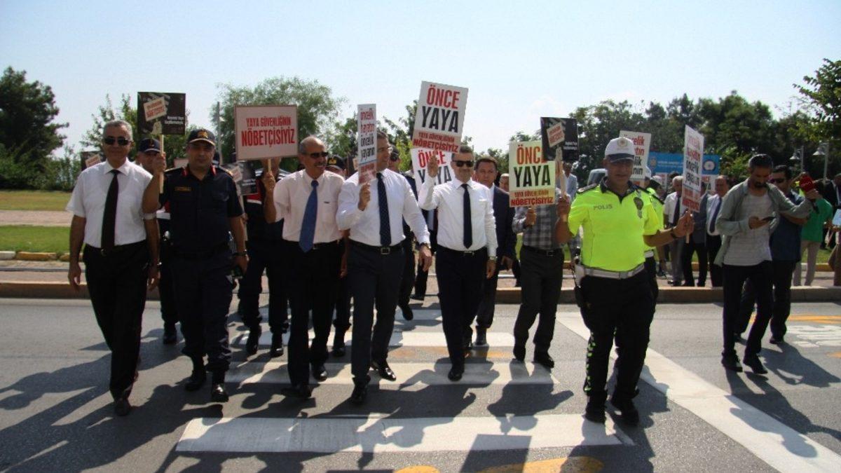 Antalya’da ‘Yaya güvenliğinin nöbetçisiyiz’ etkinliği düzenlendi. Antalya protokolü öğrenciler eşliğinde ellerinde dövizlerle trafikte yaya önceliğine dikkat çekti.
