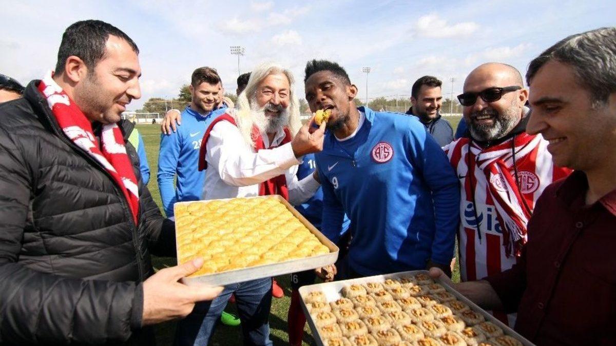Antalyaspor, Süper Lig’in 22. haftasında karşılaşacağı Akhisar Belediyespor maçının hazırlıklarını sürdürdü.Akhisar Belediyespor hazırlıklarını sürdüren Antalyaspor’u taraftarlar yalnız bırakmadı. Antalyaspor Kuzey Kale’de destekleyen 07 Gençlik Grubu’nun lideri Gürhan Güneyli, ’Amigo Miloş’ lakaplı Recep Güler, Grup 1966 önderlerinden İsmail Bulut, maraton tribünü amigolarından Uğur Seferoğlu ve taraftarlar, Atilla Vehbi Konuk Tesisleri’ne gelerek antrenmanı izledi.Taraftarlar, antrenman bitiminde heyet ve futbolculara 2 tepsi baklava ikram etti. Takım kaptanı Samuel Eto’o, baklava sevmemesine rağmen taraftarlarımız kırmayıp her iki tepsiden de birer dilim yedi. Kaleci Saso Fornezzi’ye de fazla baklava yemesi için ısrar eden taraftarlar, "Baklava yersen gol yemezsin" diyerek espri yaptı.Eto’o’dan şut dersleriAntalyaspor, hazırlıklarına taktik çalışması yaparak devam etti. Antrenmana sakatlıkları süren Yekta Kurtuluş, El Kabir ile izinli olarak ülkesine giden Ramon Motta katılmadı. Samuel Eto’o, antrenmanın bitiminde Drole ile Harun’a şut çalışması yaptırdı.