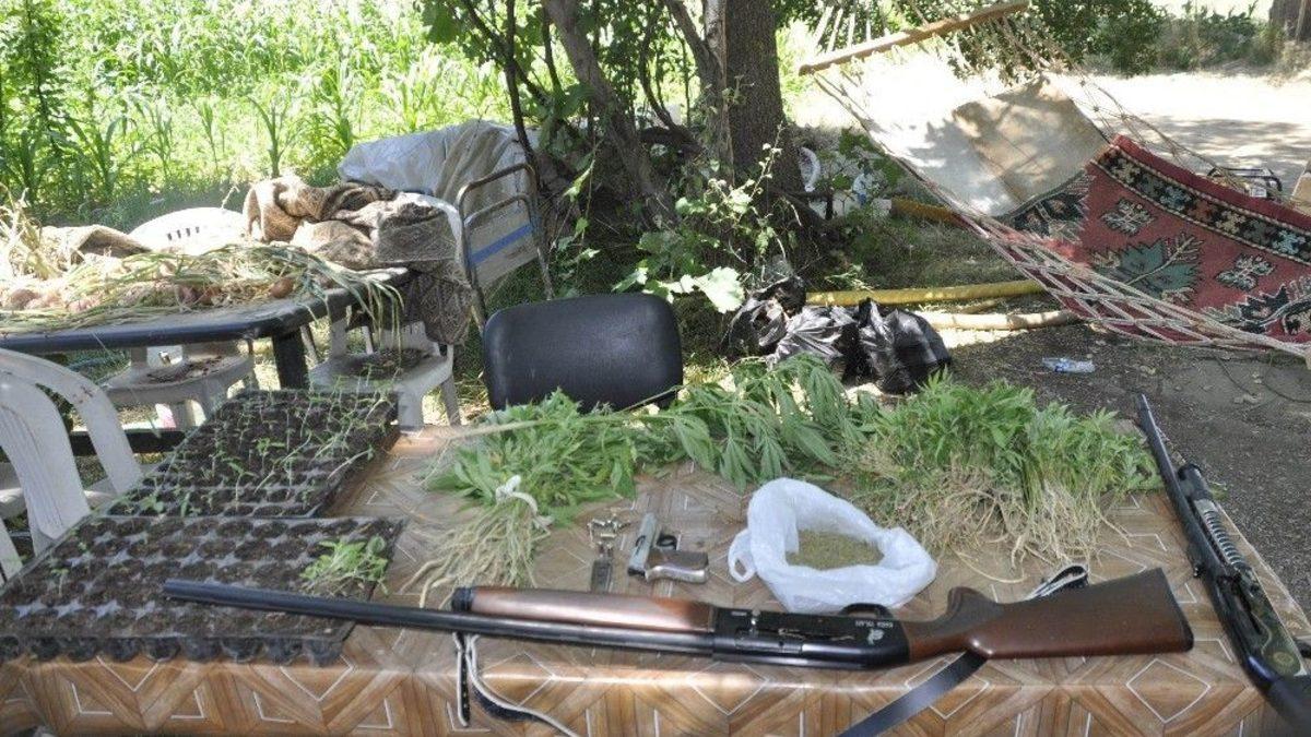 Konya’nın Seydişehir ilçesinde, bir bahçeye yapılan operasyonda bin 10 kök Hint keneviri ele geçirilirken, kenevirin ekildiği yerler ve sulama sistemi polisleri hayrete düşürdü.Edinilen bilgiye göre, bir ihbarı değerlendiren Seydişehir İlçe Emniyet Müdürlüğü Asayiş Büro Amirliği ekipleri Anabağlar Mahallesi’nde bir bahçeye baskın yaptı. Bahçe içerisinde arama yapan ekipler çalılıklar arasına mısır ve fasulyelerin arasında saksılara ve özel açılmış alanlara ekili Hint keneviri ele geçirdi. Bahçe içerisinde aramalarına devam eden ekipler damlama sulama sisteminin kuru dereye doğru gittiğini tespit edince dere kenarında ekili Hint kenevirini sulamak için damlama sulama sistemi çekildiğini tespit etti. Bahçe içerisinde bulunan kulübelerde de arama yapan ekipler özel bölmelerde fide kutularına ekili Hint kenevirleri buldu. Operasyonda, bin 10 kök Hint keneviri, 100 gram kurutulmuş Hint keneviri, cinsel uyarıcı ilaçlar ile 2 ruhsatsız av tüfeği ve 1 adet kuru sıkı tabanca ele geçirildi. Bahçeyi kiralık olarak ektiği öğrenilen Ahmet A. (62) ekipler tarafından gözaltına alındı.Olayla ilgili soruşturma devam ediyor.