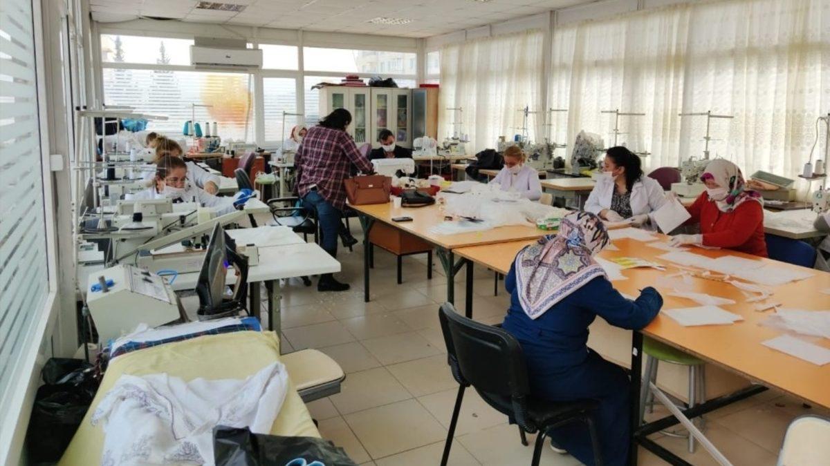 Mardin’in Artuklu İlçe Kaymakamlığı bünyesinde bulunan Halk Eğitim Merkezi Müdürlüğünde, 14 gönüllü kadın tarafından günlük 500 adet maske üretiliyor.