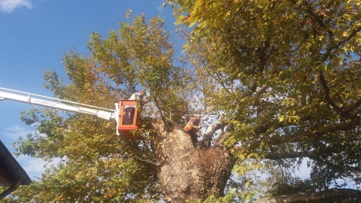 Hatay’ın Payas ilçesinde bulunan asırlık çınar ağacına kış öncesi bakım çalışması yapıldı.