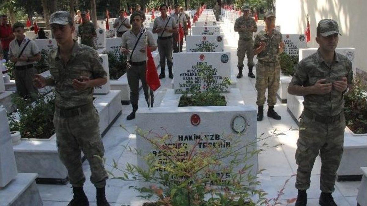 ADANA (İHA) – Adana’da Kurban Bayramı dolayısıyla şehitlikte askerler silah arkadaşları için topluca dua ederken, şehit yakınları gözyaşlarına boğuldu.Asri Mezarlıktaki şehitlik, hem askerler tarafından hem de şehit yakınları tarafından ziyaretçi akınına uğradı. Bayramda şehit olan silah arkadaşlarını yalnız bırakmak istemeyen askerler hem şehit mezarları başında gün boyu nöbet tuttu hem de onlar için topluca dua okudu. Şehit yakınları da gün boyunca şehitliği ziyaret edip Kur’an-ı Kerim okudu. Kimi oğluyla, kimi ağabeyi ile, kimi amcası, kimi dayısı, kimi ise yeğeniyle bayramlaşmak için şehitliğe geldi. Bunlardan biri de 25 yıl önce Şırnak’ta 20 yaşında şehit olan Jandarma Er Murat Tuncay’ın teyzesiydi. Teyze, yeğeninin mezarı başında "17 yıl sonra dünyaya geldin, 20 yılda gittin" diye ağıt yakarak gözyaşı döktü.