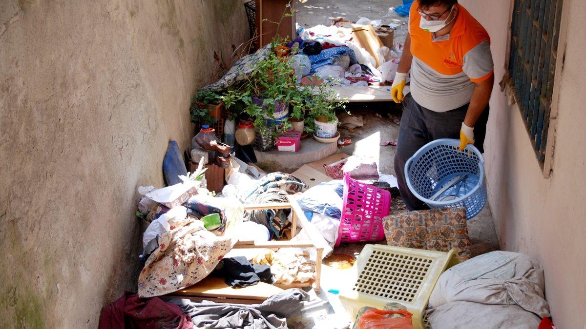Ev sahibi ile eşinin ve çocuklarının dışarı çıkarılmasının ardından çöpler, belediye temizlik işçileri tarafından kamyonlara yüklendi.