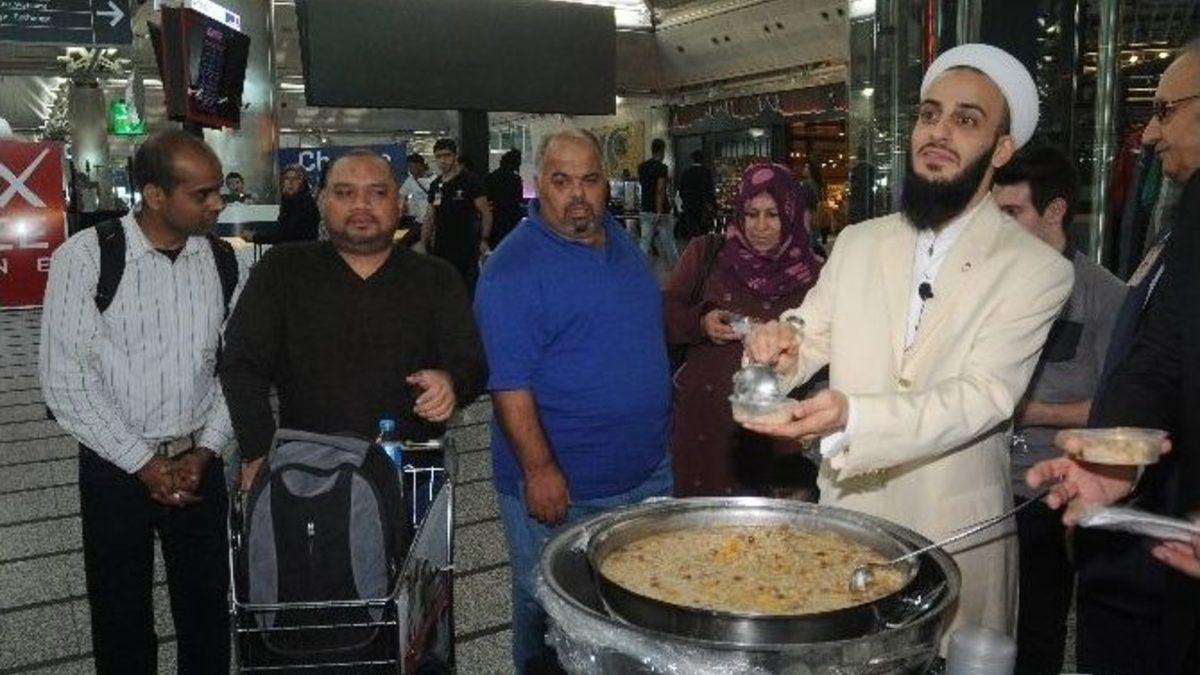 Atatürk Havalimanı’nda Muharrem ayı nedeniyle yerli ve yabancı yolculara aşure ikram etti. Aşureyi ilk kez tadan yabancı yolcular aşurenin tadını çok beğendiklerini söyledi.Muharrem ayı dolayısıyla Atatürk Havalimanı’nda seyahat eden yolculara aşure ikram edildi. Yerli ve yabancı yolcular, kendilerine ikram edilen aşurenin tadına baktı. İlk kez aşure yiyen yabancı yolcular, aşurenin tadını beğendiklerini ifade etti.Evinde kendi imkanlarıyla yaptığı aşureyi yolculara dağıtan Atatürk Havalimanı Dış Hatlar Mescidi İmam HatibiAbdülsamet Karadayı, ”Her sene havalimanımızda aşure günü münasebetiyle aşure günü ikramı yapıyoruz. Hem ülkemizi hem dinimizin güzelliklerini bütün yolcularımıza, bütün ülkelerden gelen misafirlerimize göstermeye anlatmaya çalışıyoruz. Bu sene de özellikle bu alanda daha fazla yolcu olması itibariyle böyle bir ikram yapalım dedik. Malum son zamanlarda çok değişik acı hadiseler yaşıyoruz. Hem ülkemiz hem de dinimiz üzerine çok oyunlar oynanıyor. Biz de insanlara bütün dünyadan gelen misafirlerimize hem memleketimiz hem de dinimizin güzelliklerini onlarla sohbet ederek, aşure ikram ederek konuşarak anlatıyoruz” şeklinde konuştu.“Yolcular ikramdan memnun kaldı”Daha önceki yıllarda da aşure dağıttıklarını söyleyen Karadayı, “Çok memnunlar. Daha önceki senelerden zaten biz bunu biliyoruz. İnsanlar burada aşure yiyorlar, çok memnun oluyorlar. Bu sene de yabancı katılım çok fazla olmasından dolayı çok memnun olduk. Aşurenin şöyle bir anlamı vardır. Aşure birlik beraberlik demektir, paylaşmak dayanışmak demektir. Aşure bereket,ihsan demektir. Bu aşure gününün inşallah bereketiyle havalimanımız daha çok bereketlenecek. Turizmimiz daha çok artacak. İnsanlar daha çok ülkemize, İstanbul’umuza gelecektir. İnşallah Rabbim nasip eylesin diyorum” dedi.Yabancı yolcular aşureyi tattıHindistan’dan Kanada’ya transit gitmek üzere ailesiyle havalimanında bulunan Hardeep Chawla, Sih dininden olduklarını, aşureyi ilk kez tattığını ve çok beğendiğini belirtti. Sunbir Chawla ise aşurenin İslam dini için anlamını yeni öğrendiğini belirterek, ikramda emeği geçenlere teşekkür etti.Fransız yolcu Anyess Audra, Hindistan’dan transit olarak havalimanına geldiklerini dile getirerek, ikram edilen aşureyi ilk kez İstanbul’da tattığını bildirdi.