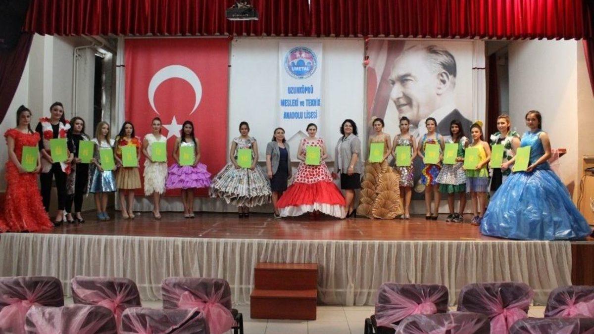 Edirne Uzunköprü Mesleki ve Teknik Anadolu Lisesi Giyim Üretim Teknolojisi Bölümü öğrencileri, kullanılmayan ve atıl durumdaki geri dönüşüm malzemelerinden tasarladığı elbiseler ile defileye hazırlanıyor.Uzunköprü Mesleki ve Teknik Anadolu Lisesi, ‘Sürdürülebilir Hayat için Doğanın Parçası Ol’ sloganı ile 5 Haziran Çevre Koruma Haftası etkinlikleri kapsamında, kullanılmayan ve atıl durumdaki geri dönüşüm malzemelerini kullanarak, çeşitli renklerde ve modellerde kostümler hazırladı. Öğrenciler, tamamen geri dönüşüm malzemelerinden oluşan kostüm ve kıyafetlerle çevre bilincine dikkat çekmeyi hedefliyor.Çöp poşetleri, pipet, gazete kağıtları, kese kağıtları, pet bardaklar, CD’ler gibi biriktirdikleri geri dönüşüm malzemelerini 1 ay öncesinden tasarlayan 17 öğrenci, ürünlerini Çevre Haftası kapsamında Uzunköprü Belediyesinin düzenleyeceği defilede sergileyecek.Giyim Üretim Teknolojisi Bölümü öğretmeni Günay Baki, doğaya ve çevreye saygı değerinden hareket ederek, insanların sürdürülebilir yaşam konularında farkındalık oluşturmayı hedeflediklerini söyledi."Geri dönüşüm malzemeleri ile hazırlandı"1 ay gibi kısa sürede tasarımları yaptıklarını belirten Baki, "Çevre duyarlılığını arttırmak, geri dönüşümün amacına dikkat çekmek amacıyla 17 öğrencimiz ile artıklardan kıyafet tasarım çalışması yaptık. Bu çalışma ile bu malzemelerin geri dönüşüme kazandırabildiğini gösterebilmek istedik. Yaklaşık 1 ay içerisinde bu çalışmayı yaptık. Bu tasarım çalışmalarında çöp poşetleri, pipet, gazete kağıtları, kese kağıtları, pet bardaklar, CD’ler gibi atık malzemeleri kullandık. Öğrencilerimiz bir süre bunları topladılar. Her öğrenci kendi tasarım çalışmasını yaparak bugüne geldik" dedi."Defile olarak sergilenecek"Çevre Haftası kapsamında defile sergileyeceklerini de belirten Baki, "Bu yaptığımız tasarım çalışmaları 5 Haziran Çevre Haftası etkinlikleri kapsamında küçük bir defile olarak sergilenecektir. Vatandaşların bir nebze de olsa çevre bilincine katkı sağlayabileceğiz" ifadelerini kullandı.Öğrenciler, okula gelen gazetelerden, kendi kullandıkları pet bardaklardan, kullanılmayan CD’lerden, çevresindeki poşetler ile tasarımları yaptıklarını söyledi.