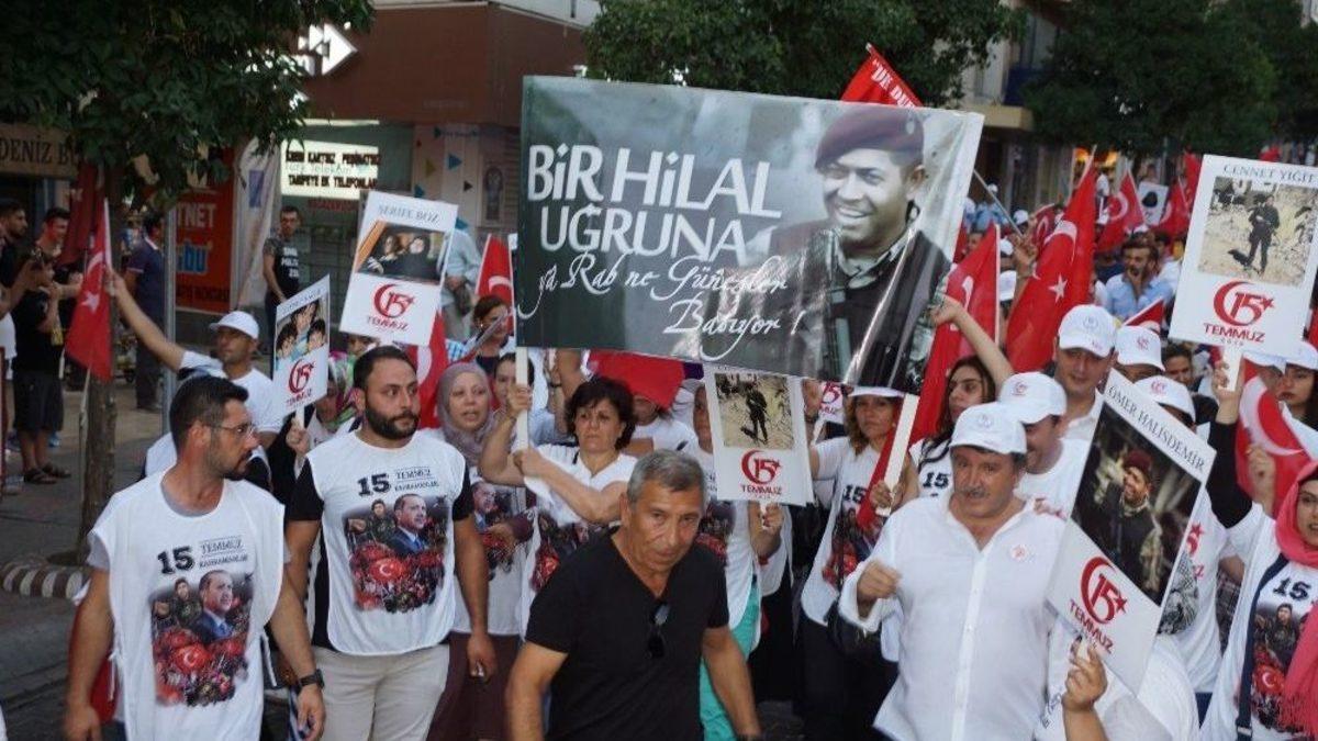15 Temmuz darbe girişiminin 1.yıl dönümünde düzenlenen anma etkinliklerine Aydınlılar yoğun ilgi gösterdi. Binlerce kişinin katılımı ile gerçekleşen ’Milli Birlik’ yürüyüşünün ardından konuşan 15 Temmuz’da Cumurbaşkanı Recep Tayyip Erdoğan’ın Marmaris’te kaldığı otelin bahçesinde şehit düşen Nedip Cengiz Eker’in babası "Oğlumun silahı cebimde, erkeklerse bir daha denesinler" diye konuştu.Milli Birlik Yürüyüşü ile başlayan etkinlik Aydın Atatürk Kent Meydanında düzenlenen program ile devam etti. Aydın Büyükşehir Belediyesi bayan mehteran takımı yürüyüş sonunda meydana toplanan kalabalığı marşlar eşliğinde karşıladı. Kent Meydanındaki program saygı duruşu ve İstiklal Marşının okunması ile başladı. Şehitler için Kuran-ı Kerim ve dualar okundu. 15 Temmuz şehidi Nedip Cengiz Eker’in babası ve Aydın Valisi Yavuz Selim Köşger vatandaşlara hitap etti.Yürüyüşün ardından kent meydanında toplanan kalabalıkla programa burada devam edildi. Kent meydanındaki program saygı duruşu ve İstiklal Marşının okunması ile başladı. Şehitler için Kuran-ı Kerim ve dualar edildikten sonra meydandaki vatandaşlar dev ekrandan 15 Temmuz Belgeseli ve 15 Temmuz şehidi Nedip Cengiz Eker’in tanıtım videosunu izledi.15 Temmuz şehidi Nedip Cengiz Eker’in tanıtım videosu duygusal anların yaşanmasına neden olurken şehidin annesi Bahar Eker videoyu izlerken fenalaştı. 15 Temmuz şehidi polis Nedip Cengiz Eker’in babası Nihat Eker etkinlikte yaptığı konuşmada oğlundan söz ederken O’nun pırlanta bir evlat olduğunu belirterek “Rabbim cennetiyle cemaliyle müşerref kılsın. Bayrakları bayrak yapan üstündeki kandır, toprak eğer uğrunda ölen varsa vatandır. Unutmamalıyız ki 15 Temmuz’da hayatını toprak uğruna feda edenler bize bu vatanı bıraktılar. Bugüne kadar büyük gururla çocuklarımıza anlattığımız Çanakkale ve Kurtuluş Savaşından sonra artık yeni bir destanımız var, 15 Temmuz Destanı” dedi."Oğlumun silahı cebimde erkeklerse bir daha denesinler"Bundan sonrada uyanık olmamız gerektiğini belirten Şehit Nedip Cengiz Eker’in babası Nihat Eker “Bundan sonra oğlumun silahı benim cebimde. Bundan sonra erkeklerse yapsınlar. O darbelere karşı artık milletim sadece bayrakla değil, savaşla düşmanlarımın alnının çatından vurmazsam namerdim” dedi.Aydın Valisi Yavuz Selim Köşger ise “Bu ülke ne zaman dara düşmüşse, bu vatan ne zaman vatandaşına yiğitlerine efelerine kızanlarına ihtiyaç duymuşsa, Aydın’ın efeleri, kızanları o noktada hazır ve nazır olmuştur. Tarihin her zor noktasında bütün Anadolu halkı gibi bütün bu toprakların insanları yiğitleri gibi bu Efeler de hazır ve nazır olmuştur. Her zor noktada her dar noktada her dara düştüğümüzde nasıl Efeler olmuşsa 15 Temmuz’da da bu meydanlarda siz vardınız. 15 Temmuz’da da bu meydanları siz doldurdunuz ve bu ülkeye kast edenlere dahili bedhahlara haddini bir kere daha siz bildirdiniz. Yörük Ali Efe’nin torunları bugün Nedip Cengiz Eker olarak tekrar ortaya çıkmış 15 Temmuz’da gereken noktada gereken dersi gerekenlere vermiştir. Bu emperyalistlerin bu sömürgecilerin bu adamların hesapları kitapları bitmiyor. Karşıdan geldiklerinde bizi yenemeyeceklerini bizi alt edemeyeceklerini biliyorlar. Bizi tarihin tozlu sayfalarına gömemeyeceklerini biliyorlar. Bu ülkenin bu milletin göz bebeği dediği peygamber ocağı dediği silahlı kuvvetlerinin içine sızdırdıkları robotlardıştıkları, mankurtlaştırdıkları kahbelerle alçaklarla bu milletin vergileriyle ödenmiş silahları bu millete doğrulttular. Bu açıdan tarihin gördüğü en kahpe en sinsi ve başka hiçbir milletin üzerinden üstesinden gelemeyeceği kadar dehşetli bir kalkışmaydı. Ve 15 Temmuz’da bu millet durumun çok daha vahim olduğunu askerin kendisine silah doğrulttuğunu fark ettiği zaman işte bütün milletimiz destansı bir şahlanışla duruma ve vaziyete el koymuştur ve gereğini yapmıştır” dedi.Konuşmaların ardından Cumhurbaşkanı Recep Tayyip Erdoğan’ın konuşmaları meydandakiler tarafından dev ekrandan izlendi.Atatürk Kent Meydanındaki 15 Temmuz etkinliklerine Aydın Valisi Yavuz Selim Köşger ve eşi Fatma Köşger, Aydın Büyükşehir Belediye Başkanı Özlem Çerçioğlu, Aydın Garnizon Komutanı Albay Mehmet Parım, Aydın İl Jandarma Komutanı Halil Şen, Aydın Emniyet Müdürü Dr. Rahmi Baştuğ, AK Parti İl Başkanı Ömer Özmen, MHP İl Başkanı Levent İlter, 15 Temmuz şehidi Nedip Cengiz Eker’in Annesi Bahar Eker, Babası Nihat Eker, ADÜ Rektörü Cavit Bircan, daire amirleri ve binlerce vatandaşlar katıldı.