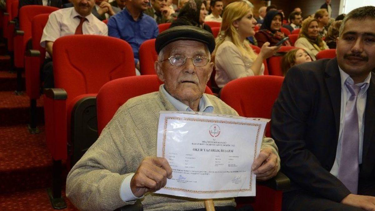 Denizli’de yetişkinlere yönelik başlatılan okuma yazma kurslarından mezun olan 4 bine yakın kursiyer için temsili belge dağıtım töreni yapıldı. Törende en dikkat çeken kişiler ise 82 yaşındaki Mustafa Kayhan ile kursa çocukları ile giden 4 çocuk annesi 38 yaşındaki Mevlüde Güler oldu.Milli Eğitim Bakanlığı Hayat Boyu Öğrenme Genel Müdürlüğü tarafından başlatılan ve Denizli İl Milli Eğitim Müdürlüğü koordinesinde devam eden kurslardan mezun olan kursiyerler için sertifika dağıtım töreni gerçekleştirildi. Valilik toplantı salonunda gerçekleştirilen törene Vali Hasan Karahan, İl Milli Eğitim Müdürü Mahmut Oğuz ve ilçe protokolünün katıldı. Törende mezun olan 4 bine yakın kursiyer adına 40’a yakın kursiyere temsili sertifikaları dağıtıldı.Törende 82 yaşında okuma yazma öğrenen Mustafa Kayhan en dikkat çeken isimler arasında oldu. Bir ailesi üyesinin yardımıyla törene gelen Kayhan, ailesinin kendisini hayvanlara bakmak için okula göndermediğini ama azmederek sonunda okuma-yazma öğrendiğini dile getirdi. Kayhan, 82 yaşında olmasına rağmen okuma-yazma bildiğine dair sertifika aldığı için çok mutlu olduğunu da sözlerine ekledi.En büyük destekçileri eşleri ve torunları olduTörende bir başka dikkat çeken isim ise 4 çocuk annesi 38 yaşında Mevlüde Güler oldu. Okuma yazma kursuna çoğunlukla çocuklarıyla gittiğini belirten Güler, okuma-yazma öğrenmedeki en büyük destekçinin ise eşi olduğunu kaydetti. Güler, "6 ay boyunca kendi çocuğumla kursa geldim. Zamanında maddi durum olmadığını için babam okutmadı. Sonra bu kurs bir fırsat olarak önüme çıktı ve kaçırmadım. Kursa giderken de eşim destekçim oldu ‘kendini geliştir’ diye. Kursa da küçük kızım ile birlikte gittim" dedi.75 yaşındaki Fatma Halaççı ve 60 yaşındaki Nazmiye Tutkun’da kursa giderek başarılı olup sertifikalarını aldı. Fatma ve Nazmiye teyze ise kurs boyunca özellikle torunlarının kendilerine çok yardımcı olduklarını belirtti.Tören kursiyerlerin aldıkları sertifikalar ile poz vermelerinin ardından sona erdi.