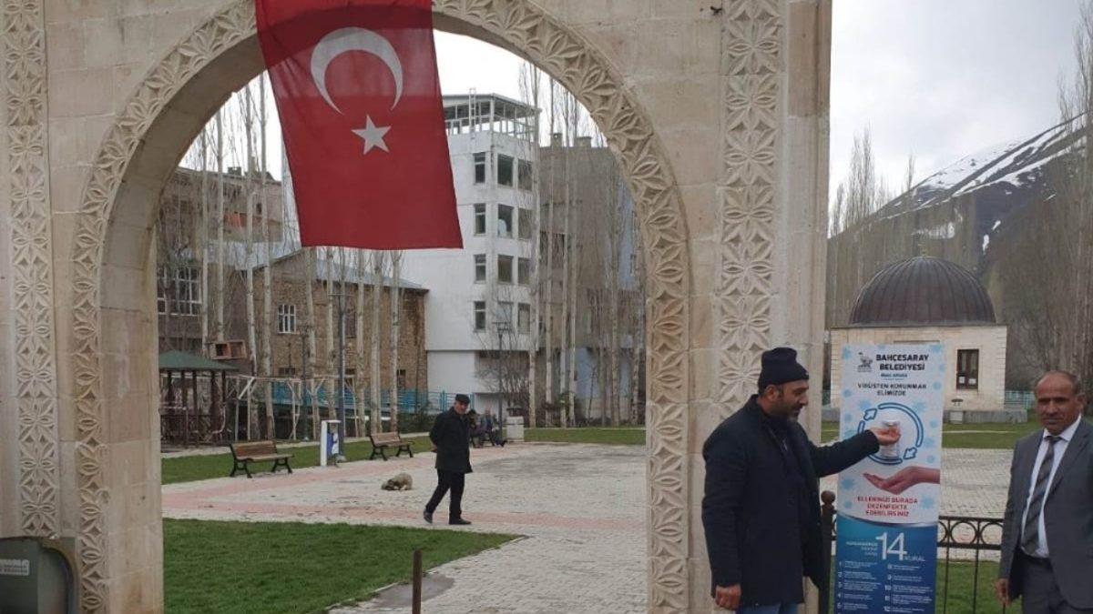 Van’ın Bahçesaray Belediyesi, korona virüsü tedbirleri kapsamında ilçenin farklı yerlerine el dezenfekte istasyonları kurdu.