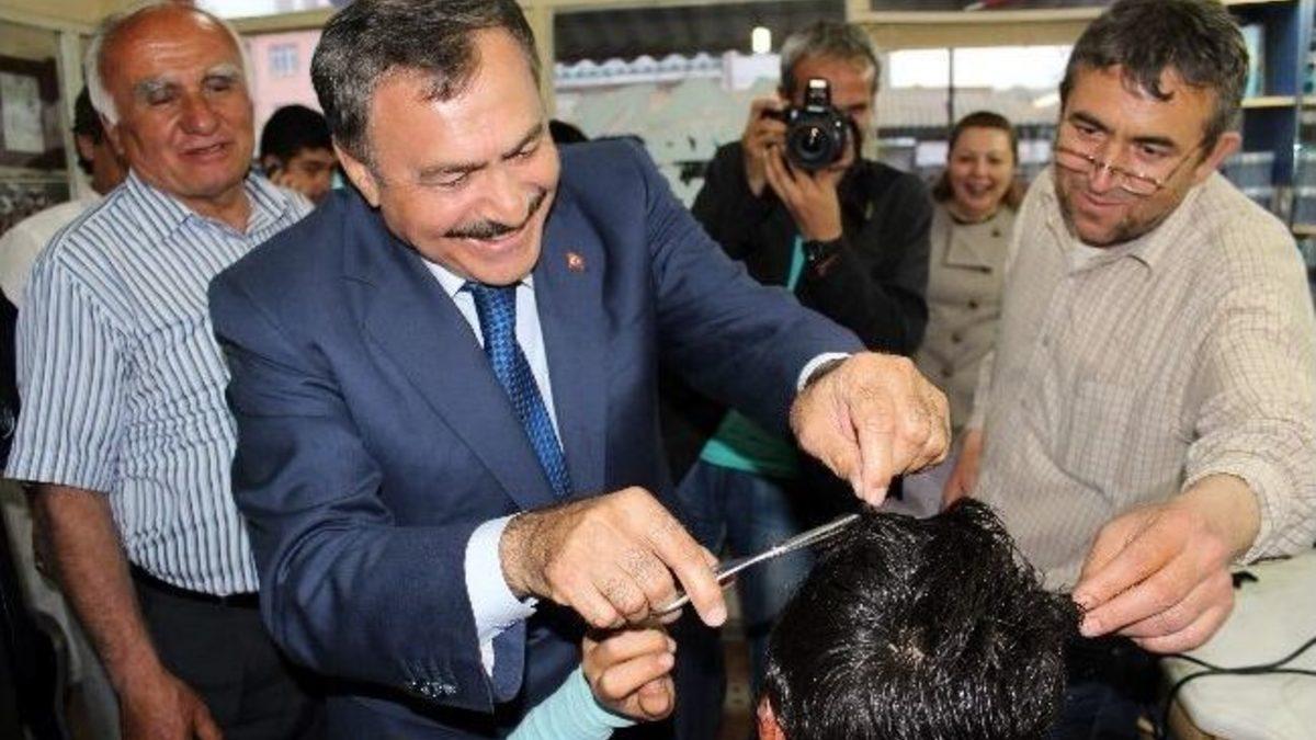 Orman ve Su İşleri Bakanı Prof. Dr. Veysel Eroğlu, esnaf ziyareti sırasında girdiği bir berber dükkanında makası eline alarak, tıraş olmayı bekleyen bir çocuğun saçlarını kesti.Bakan Eroğlu, Yüksek Seçim Kurulu (YSK) tarafından iptal edilen ve 1 Haziran’da tekrarlanacak olan yerel seçimler münasebetiyle Eskişehir’in Mahmudiye ilçesinde esnaf ziyaretinde bulundu. İlçedeki birçok esnafı gezerek AK Parti Belediye Başkan adayı Ayşe Güney’e destek isteyen Bakan Eroğlu, esnaflara lokum da dağıttı. Gezisi sırasında bir berber dükkanına giren Eroğlu, burada tıraş olmayı bekleyen bir çocukla karşılaştı. Esprili bir şekilde çocuğa yaklaşan Bakan Eroğlu, eline aldığı makasla çocuğun saçını kesti. Bu sırada renkli görüntüler oluşurken, Eroğlu çocukla kısa bir süre sohbet ettikten sonra dükkandan ayrıldı.İlçe ziyareti kapsamında Eroğlu, son olarak Balçıkhisar Mahallesi’nde vatandaşların istek ve şikayetlerini dinledi.