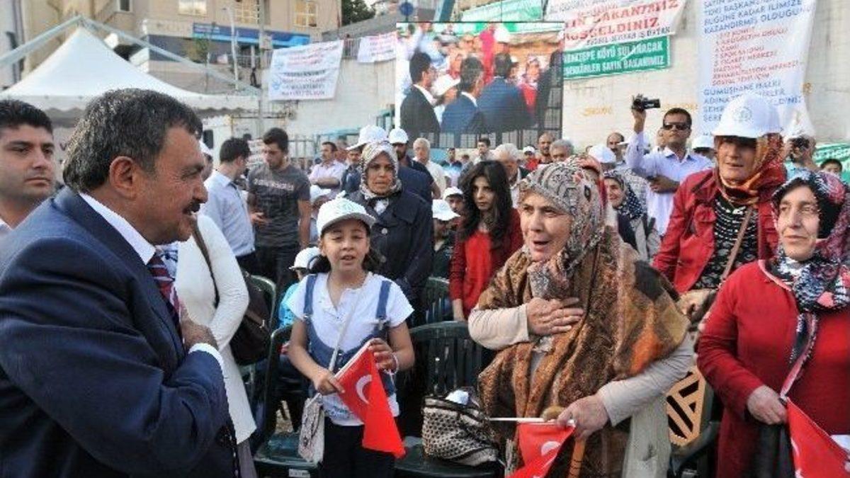 Orman ve Su İşleri Bakanı Prof. Dr. Veysel Eroğlu ile Çevre ve Şehircilik Bakanı Erdoğan Bayraktar, 90 milyon lira tutarındaki 13 tesisin toplu temel atma töreni için Gümüşhane’ye geldi.Zafer Meydanı'nda vatandaşların da katılımı ile gerçekleştirilen törende konuşan Bakan Eroğlu, nüfusuna göre en büyük müjdeyi Gümüşhane’ye verdiklerini belirterek 259 milyon lira tutarında 39 müjde ile geldiğini söyledi.AK Parti iktidarı olarak hep ilkleri gerçekleştirdiklerini kaydeden Bakan Eroğlu, son 10 yılda Türkiye’nin muhteşem bir dönüşüm yaşadığını belirtti. AK Parti iktidarları döneminde İMF’den borç alarak memurunun maaşını ödeyen bir Türkiye’den İMF’ye borç veren bir Türkiye’ye geçiş yapıldığını dile getiren Bakan Eroğlu, “Nereden nereye. Hükümetimiz yeni destanlar yazıyor. Sağlıkta, ulaşımda, tarımda kısacası her alanda destanlar yazılıyor.” dedi.Çevre ve Şehircilik Bakanı Erdoğan Bayraktar ise konuşmasında yatırımların kalkınmanın bir göstergesi olduğuna vurgu yaparak, 10 yılda Gümüşhane’nin şehir olma özelliğinin arttığını söyledi. Türkiye’de siyaseti değil, hizmeti esas alan bir anlayışla çalıştıklarının altını çizen Bakan Bayraktar, “Türkiye çok daha gelişecek. Türkiye nereden nereye geldi” ifadelerini kullandı.Vali Dr. Yusuf Mayda, Milletvekilleri Doç.Dr. Kemalettin Aydın, Feramuz Üstün, Devlet Su İşleri (DSİ) Genel Müdür Vekili Ömer Özdemir’in de birer konuşma yaptığı törende daha sonra toplu temel atma törenine geçildi.Zafer Meydanında telekonferans yöntemiyle Köse ilçesine bağlı Yaylım köyünde yapılacak ve 4 bin dekar araziyi sulayacak olan Şehit Osman Yıldız göletinin temelini şehidin babası Zafer Yıldız attı. Tören sırasında yüklenici firma yetkilisi ile zaman üzerine pazarlık yapan her iki Bakan, normal şartlarda 2016 yılında bitecek iş için 15 Aralık 2014 tarih ve saat 14.29’a söz alarak taahhütname imzaladı.Törenin ardından protokol üyeleri daha sonra Gümüşhane Valisi Dr. Yusuf Mayda’yı makamında ziyaret etti. Şehrin genel durumu hakkında her iki Bakana da brifing veren Vali Dr. Yusuf Mayda, daha sonra Bakanlara Karaca Mağarasını temsil eden rölyef tablo hediye etti.