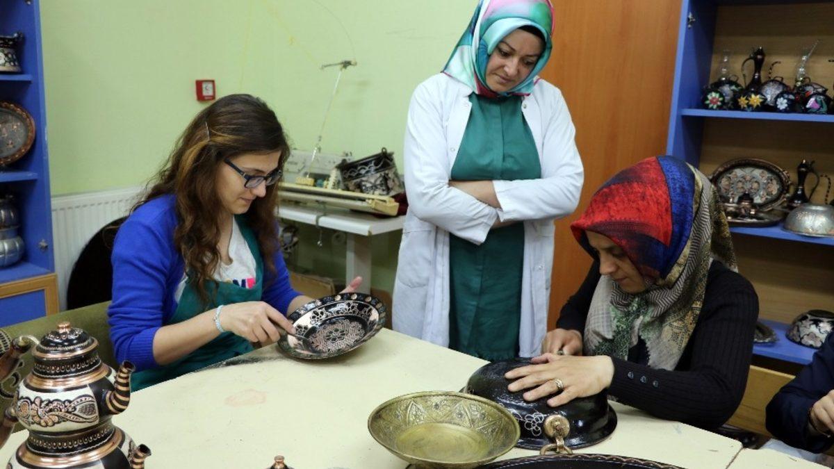 Yozgat Halk Eğitim Merkezi ve Akşam Sanat Okulu bünyesinde açılan bakır işlemeciliği kursunda kadınlar, her türlü eski bakır eşyayı kursta işleyerek modern hale getiriyor.