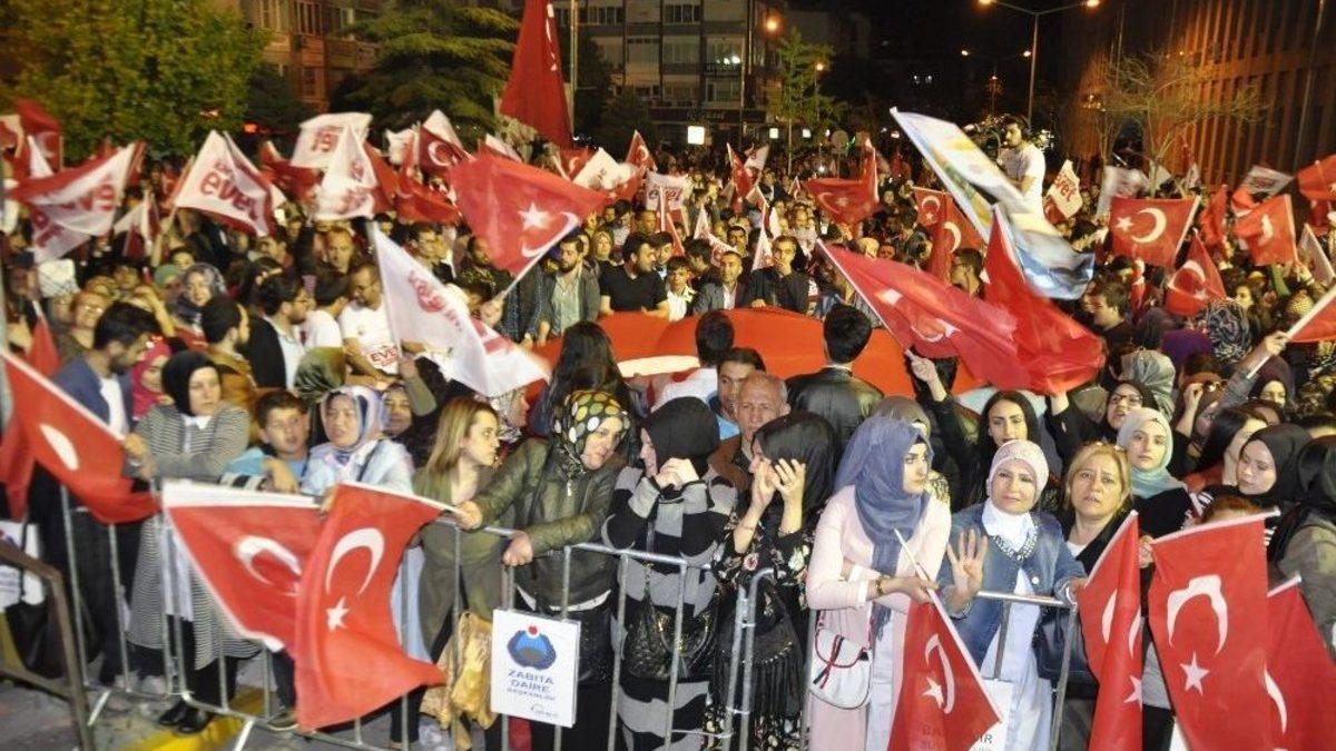 Anayasa değişikliğinin oylandığı referandum sonuçlarının açıklanması ve ’evet’ oylarının fazla çıkmasıyla vatandaşlar sevinç gösterisinde bulunmak üzere Balıkesir 15 Temmuz Şehitleri Meydanı’nda bir araya geldi.AK Parti Balıkesir İl Başkanı Hasan Demiraslan, 2 ay önce çıktıkları yolda çabalarının boşa çıkmadığını söyledi. Başkan Demiraslan, "Allah’a hamdolsun. 2 ay boyunca gece gündüz demedik çalıştık. Bugün, Allah bizi zafere kavuşturdu. Kurtuluş Savaşı’nda dedelerimiz bu davaya sahip çıkmış ise bugün yine bu memleket davaya sahip çıktı" dedi.Altıeylül Belediye Başkanı Zekai Kafaoğlu, ise bundan sonra Türkiye’nin yükselişini izleyeceklerini söyledi. Kafaoğlu, "Burası Kuvayi Milliye şehri. Kuvayi Milliye’yi yürekten selamlıyorum. Anayasanın 18 maddesinin değiştirilmesi ile ilgili olarak sandığa gittik. Halkımız tercihlerini yaptı ve yüzde 51’in üzerinde bir oyla Cumhurbaşkanlığı hükumet sistemini kabul ediyoruz dediler. 15 Temmuz diriliş, 16 Nisan yükseliş oldu. Bundan sonra ülkemizin yükselişini seyredeceğiz. Emeklerinizden dolayı hepinize teşekkür ediyorum. Geleceğiniz aydınlık olsun" dedi.Karesi Belediye Başkanı Yücel Yılmaz ise coşkulu kalabalığa hitap etti. Başkan Yılmaz, "40 yıldır süren vesayetin sonu ve ayağımızda pranga kalmamıştır. Artık mazeret yok. 2023’den 2071’e kadar hedefleri bu kadrolarla gerçekleştirmek için çalışacağız" dedi.Balıkesir Büyükşehir Belediye Başkanı Ahmet Edip Uğur ise, "Bugün aziz milletimiz bir karar verdi ve dedi ki, ’Biz tam demokrasi istiyoruz. Biz darbe istemiyoruz, vesayet istemiyoruz. İdam edilen Başbakanlar istemiyoruz’ Milletimiz bir defa daha Cumhurbaşkanımız Recep Tayyip Erdoğan’a sahip çıktı. Referandum halk oylamasına kimler karşı çıktı Fetö. Milletimiz de bunun cevabını verdi. Avrupa, Almanya’sı, Hollanda’sı, Fransa’sı hepsi hayır diye propaganda yaptı. Ama bu millet onlara da cevap verdi. Bundan sonra arttık ülkemizde istikrar olacak" dedi.Uğur sözlerinin devamında şunları söyledi: "Rahmetli Turgut Özal, Necmettin Erbakan, Süleyman Demirel ve Alparslan Türkeş hepsi Başkanlık sistemi dedi. Ben buradan Devlet Bahçeli ve MHP’lilere de teşekkür ediyorum, sağ olsunlar. Sayın Bahçeli Devlet adamı olduğunu bir kez daha gösterdi. Türkiye’yi bölmek parçalamak isteyenler, Türkiye’yi borç alan ve emir alan bir ülke yapmak isteyenlere milletimiz gereken cevabı verdi. Evet diyen de hayır diyen de aynı. Biz kimseyi ötekileştirmiyoruz. Bu millet yine birdir beraberdir. Oy oranlarını tartışmanın manası yok. Yok yüzde 51 aldın yok yüzde 53 aldın demek olmaz. Neticede millet kazandı"Yeni sistemle birlikte Milletvekili sayısının da 600’e çıkacağını söyleyen Uğur, "Bundan sonra Balıkesir, 9 Milletvekili ile mecliste temsil edilecek. Hepinizi hayırlı uğurlu olsun" şeklinde sözlerini sonlandırdı.AK Parti Balıkesir Milletvekilleri Kasım Bostan, Mahmut Poyrazlı’da sevinç gösterilerinde bulunan vatandaşlara hitap etti.