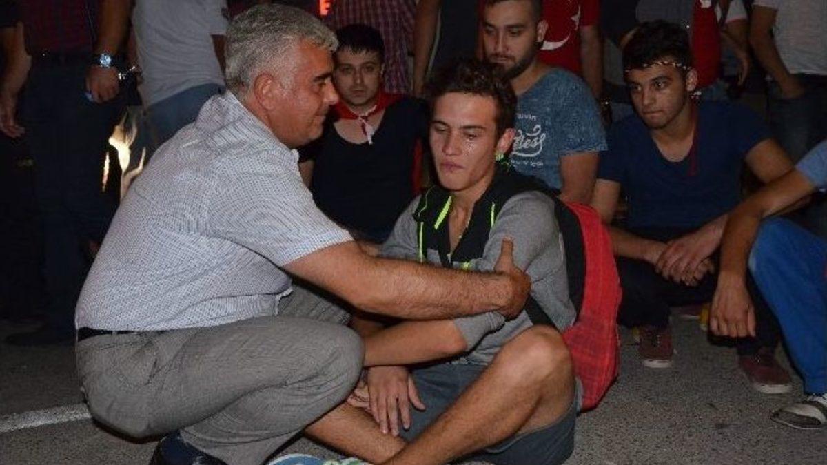 Eskişehir’de, Hakkari’nin Dağlıca bölgesinden gelen şehit ve yaralı haberlerinin ardından sokağa dökülen bir grup vatandaşın, Halkların Demokratik Partisi (HDP) İl Başkanlığı binasındaki parti tabelasını indirmek istemesine polis ekipleri izin vermedi. Bu sırada polis barikatının önüne oturarak ağlamaya başlayan bir genci ise yine bir polis sarılarak teselli etti.Üniversite Caddesi’nde bir alışveriş merkezi önünde toplanan yaklaşık 300 kişilik kalabalık, dev Türk Bayrağı’yla ve tekbirler eşliğinde, “Ne mutlu Türk’üm diyene”, “Şehitler ölmez vatan bölünmez”, “Her Türk asker doğar” sloganlarıyla Sakarya Caddesi üzerinde bulunan HDP İl Başkanlığı’na doğru yürüyüşe geçti. Sakarya Caddesi’ne çıkan bir ara sokakta polis barikatıyla karşılaşan grup, tekbirler eşliğinde barikatı aşarak cadde üzerinde bekleyen bir diğer polis barikatı ve TOMA’nın önüne kadar geldi. HDP’nin binasına ulaşarak parti tabelasını indirmek isteyen gruba polis ekipleri izin vermedi.Grup üyeleri, yanlarında getirdikleri bir Türk Bayrağı’nı plastik kelepçeyle apartman girişine asarak TOMA ve barikatın önünde bekleyen kalabalığın yanına döndü.BARİKATIN ÖNÜNDE AĞLAYAN GENCİ POLİS SAKİNLEŞTİRDİÖte yandan bir yakının şehit olduğunu söyleyen gruptan bir genç, polis barikatının önüne oturarak ağlamaya başladı. Bunu gören bir polis, ağlayan gence sarılarak onu teselli etti. Daha sonra barikatın önünden kalkan genç, diğer grup üyelerinin yanına gitti.Bir süre parti tabelasının indirilmesi hususunda ısrar eden kalabalık, polis müdürleriyle yaptıkları konuşmalarının ardından olaysız şekilde dağıldı.