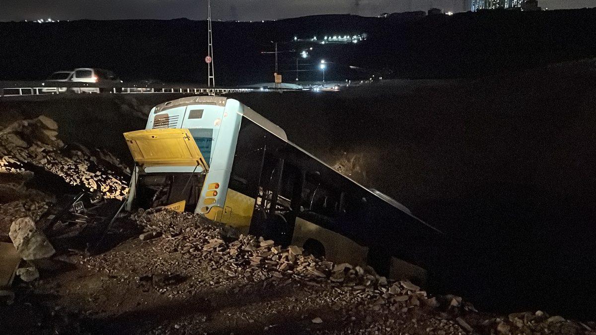 Refüjdeki aydınlatma direğine çarpan otobüs, yolun bitimindeki şarampole devrildi.