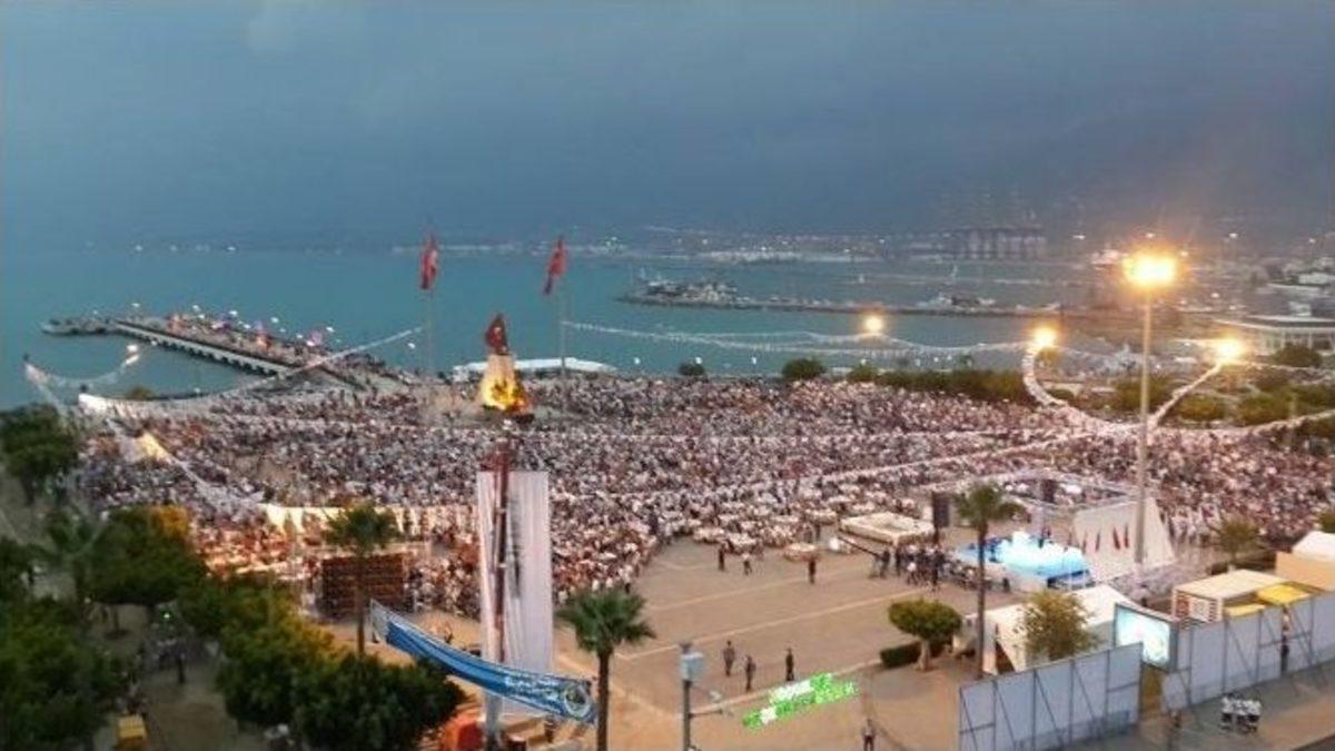 Cumhurbaşkanı adayı ve Başbakan Recep Tayyip Erdoğan, Hatay’ın İskenderun ilçesinde belediyenin düzenlediği 30 bin kişilik iftar yemeğine katıldı.Hatay’da Antakya mitingi sonrası helikopterle İskenderun’a gelen Başbakan Erdoğan, coşku ile karşılandı. Başbakan Erdoğan’a eşi Emine Erdoğan, kızı Sümeyye Erdoğan ile Enerji ve Tabii Kaynaklar Bakanı Taner Yıldız da eşlik etti. Sivil vatandaşların polis giriş noktasından etkinlik alanına geçiş yapan Bakan Yıldız, vatandaşlar ile hatıra fotoğrafı çektirip ayaküstü sohbet etti. Etkinliğin düzenlendiği Atatürk Anıtı alanında Sahil Güvenlik feribotları ve Özel Harekat Timleri ile güvenlik önlemleri aldılar. İftar programına iş ve sanayi dünyasından birçok isim ile Hatay’ın ilçe belediye başkanları katıldılar.Halk ile bir arada iftarını açan Başbakan Erdoğan, daha sonra platform alanına geçerek halka hitaben bir konuşma yaptı. Sona eren programın ardından Başbakan Erdoğan, İskenderun Belediye Başkanı Seyfi Dingil’i makamında ziyaret etti. Ziyaretin ardından Başbakan Erdoğan ile eşi Emine Erdoğan ve Bakan Taner Yıldız, helikopterle İskenderun’dan ayrıldılar.