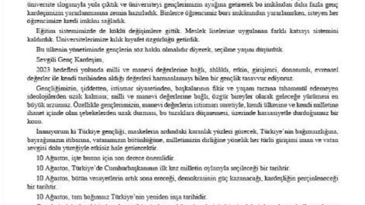 Cumhurbaşkanı adayı ve Başbakan Recep Tayyip Erdoğan, gençlere mektup göndererek, paralel yapıdan uzak durulması ve paralel yapının tuzaklarına düşülmemesi konusunda uyarılarda bulundu.Cumhurbaşkanı adayı ve Başbakan Recep Tayyip Erdoğan, 10 Ağustos cumhurbaşkanlığı seçimi için gençlere iletilmek üzere bir mektup kaleme aldı. AK Parti Genel Merkez Gençlik Kolları koordinasyonunda tüm illerde gençlik kolları üyeleri tarafından yaklaşık 3 milyon gence verilecek olan mektupta Erdoğan, Türkiye’nin gençlerine her zaman inandığını ve güvendiğini belirtti.Gençlerin, her alanda en iyi, en kaliteli ve en modern imkanlara kavuşması için AK Parti iktidarının 12 yıl boyunca çok önemli yatırımlar yaptığını hatırlatan Erdoğan, tam bağımsız Tu¨rkiye’nin yeniden ins¸a tarihi olan 10 Ağustos günü gençlerin her birinden, bu tarihi günde sandığa gitmeleri, hür iradeleriyle oylarını kullanmaları ricasında bulundu.“İHANET ŞEBEKESİ UYARISI”Başbakan Recep Tayyip Erdoğan’ın kaleme aldığı mektupta dikkat çeken bir başka konu ise paralel yapıyla ilgili oldu. Başbakan Erdoğan, “Manevi değerlerin istismarı suretiyle, kendi ülkesine ve kendi milletine ihanet içinde olan şebekelerden uzak durması, bu tuzaklara düşmemesi, üzerinde hassasiyetle durduğumuz bir konu” dedi.Başbakan Erdoğan’ın kaleme aldığı mektup şöyle:“Değerli Genç Kardeşim,Seni, aileni ve tüm sevdiklerini en kalbi muhabbetlerimle selamlıyorum.Türkiye’nin son derece önemli bir dönüm noktasına yaklaştığı bugünlerde, Yeni Türkiye’nin enerjisi ve dinamizmi olarak sana ve tüm genç kardeşlerimize yürekten inandığımızı bir kez daha hatırlatmak istiyorum.Yeni Türkiye, hiç şüphesiz gençler tarafından inşa edilecek ve gençlerin Türkiye’si olacak.Türkiye’nin gençlerine her zaman inandık ve güvendik. Gençlerimizin, her alanda en iyi, en kaliteli ve en modern imkanlara kavuşması için 12 yıl boyunca çok önemli yatırımlar yaptık. Gençlik için yapılan yatırımların miktarını, 12 yıllık süreçte tam 15 kat attırdık. En büyük yatırımı eğitime ve üniversitelerimize yaptık; her ile bir üniversite sloganıyla yola çıktık ve üniversiteyi gençlerimizin ayağına getirerek bu imkandan daha fazla genç kardeşimizin yararlanmasına zemin hazırladık. Binlerce öğrencimiz burs imkanından yararlanırken, isteyen her öğrencimize kredi imkanı sağladık.Eğitim sistemimizde de köklü değişimlere gittik. Meslek liselerine uygulanan farklı katsayı sistemini kaldırdık. Üniversitelerimize kılık kıyafet özgürlüğü getirdik.Bu ülkenin yönetiminde gençlerin söz hakkı olmalıdır diyerek, seçilme yaşını düşürdük.Sevgili Genç Kardeşim,2023 hedefleri yolunda milli ve manevi değerlerine bağlı, ahlaklı, etkin, girişimci, donanımlı, evrensel değerler ile kendi tarihinden aldığı değerleri harmanlamayı bilen bir gençlik tasavvur ediyoruz.Gençliğimizin, şiddetten, istismar siyasetinden, başkalarının fikir ve yaşam tarzına tahammül edemeyen ideolojilerden uzak kalması; milli ve manevi değerlerine bağlı, özgür bireyler olarak geleceğe yürümesi en büyük arzumuz. Özellikle gençlerimizin, manevi değerlerin istismarı suretiyle, kendi ülkesine ve kendi milletine ihanet içinde olan şebekelerden uzak durması, bu tuzaklara düşmemesi, üzerinde hassayitle durduğumuz bir konu.İnanıyorum ki Türkiye gençliği, maskelerin ardındaki karanlık yüzleri görecek, Türkiye’nin bağımsızlığına, bayrağımızın itibarına, vatanımızın bütünlüğüne, milletimizin dirliğine yönelik her türlü girişimi iman ve vatan sevgisiyle dolu yüreğiyle etkisiz hale getirecektir.10 Ağustos, işte bunun için son derece önemlidir.10 Ağustos, Türkiye’de Cumhurbaşkanın ilkkez milletin oylarıyla seçileceği bir tarihtir.10 Ağustos, bütün vesayetlerin artık sona ereceği, demokrasinin güç kazanacağı, kardeşliğin perçinleneceği bir tarihtir.10 Ağustos, tam bağımsız Türkiye’nin yeniden inşa tarihidir.Gençlerimizin her birinden, bu tarihi günde sandığa gitmelerini, hür iradeleriyle oylarını kullanmalarını, tarihi bizzat yazmalarını ve bu gururu da hayatları boyunca yüreklerinde taşımalarını diliyorum.Genç kardeşim, bilmeni isterim ki, eğer sen yoksan, bir kişi eksik yazılacak.Bu tarihi günde, yüreğinle, umudunla ve heyecanınla sandık başında olmanı, Yeni Türkiye’nin inşasına katkıda bulunmanı senden rica ediyorum.Cumhurbaşkanlığı seçimlerinin ülkemize, milletimize, coğrafyamıza ve tüm insanlığa hayırlar getirmesini temenni ediyor, senin ve aileni en kalbi duygularımla selamlıyorum.Recep Tayyip Erdoğan Başbakan, Cumhurbaşkanı adayı…”