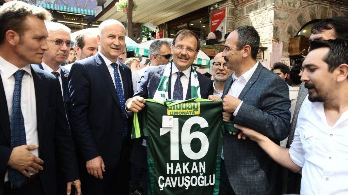 Başbakan Yardımcısı Hakan Çavuşoğlu, bir dizi ziyaret için geldiği Bursa’da Kapalı Çarşı ve Uzun Çarşı esnafını ziyaret etti. Çavuşoğlu, sokakta türkü söyleyip, bağlama çalan müzisyeni dinleyerek, bahşiş verdi.Kabine değişikliğinin ardından Başbakan Yardımcılığı görevine getirilen Bursa Milletvekili Hakan Çavuşoğlu, bir dizi ziyaret için Bursa’ya geldi. İlk olarak Bursa Valisi İzzettin Küçük’ü makamında ziyaret eden Çavuşoğlu, daha sonra Bursa Büyükşehir Belediye Başkanı Recep Altepe ile bir araya geldi. Emir Sultan Camii’nde namaz kılıp dua eden Çavuşoğlu, ardından AK Parti İl Binası’na gelerek AK Parti İl Başkanı Cemalettin Torun ile görüştü.Ziyaretlerin ardından önce Kapalı Çarşı esnafına ‘hayırlı işler’ diyen Başbakan Yardımcısı Hakan Çavuşoğlu’na burada Bursaspor forması ve atkısı hediye edildi. Sokakta bağlama çalıp türkü söyleyen müzisyeni dinleyen Çavuşoğlu, bahşiş verdi.Başbakan Yardımcısı Hakan Çavuşoğlu, Karacabey ve Mustafakemalpaşa ilçelerinde doludan zarar gören tarlaları incelemek ve çiftçilerle görüşmek üzere Bursa’dan ayrıldı.