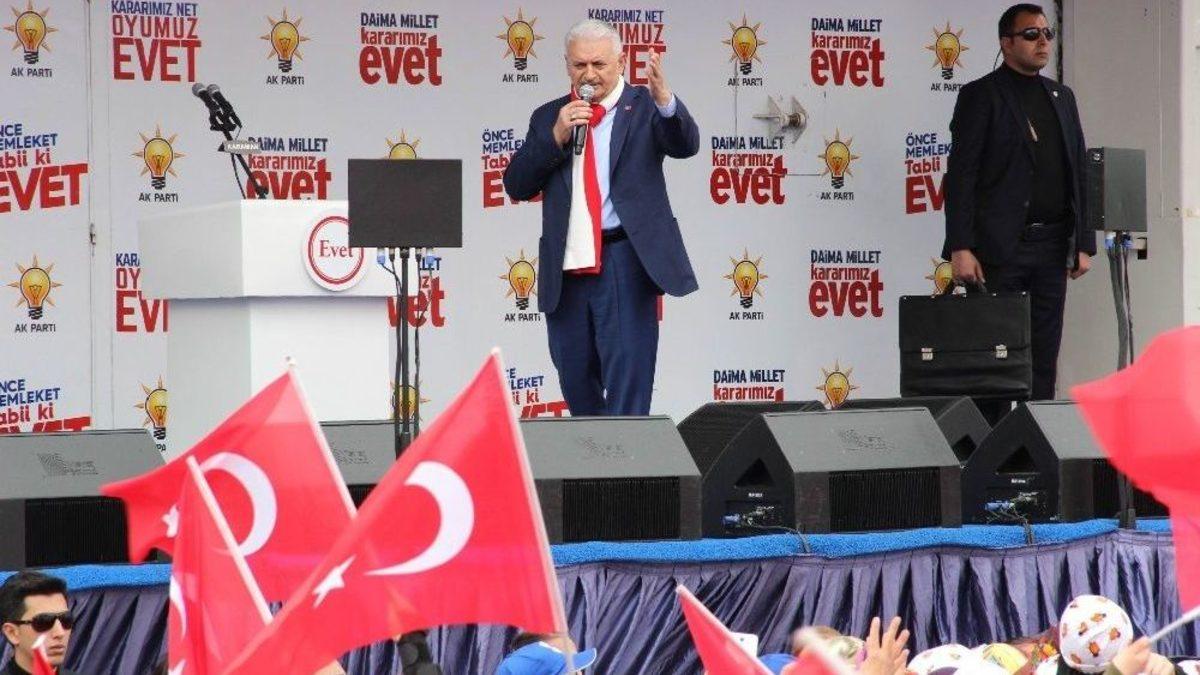 Başbakan Binali Yıldırım, 16 Nisan’da milletin vesayet odalarının da kırmızı kart göreceğini belirterek, “Türkiye geleceğe doğru emin adımlarla ilerleyecek. Büyük değişime sayılı günler kaldı. Bugün 19 günümüz var. Şimdi hayır şarkısını söyleyenler baktı ki millet bunlara aldırış etmiyor evet demeye karar vermiş, telaşlandılar. Ne diyeceklerini ne yapacaklarını şaşırdılar. Acaba bugün hangi yalanı uydursam diye her gün saatlerce düşünüyorlar” dedi.Başbakan Binali Yıldırım, Aktekke 15 Temmuz Demokrasi Meydanı’nda halka hitap ederek, “Türkiye’ye uzanan zalimlerin ellerini kırmaya hazır mısın? 16 Nisan da bağımsız Türkiye için, güçlü Türkiye için evet diyecek miyiz? Karaman işi bitirmiş, Karaman’a yakışan da budur. 16 Nisan’da Karaman’da sandıklar evet oylarıyla dolup taşacak mı? 16 Nisan’da mühürler Türkiye’nin geçeği için basılacak mı? 16 Nisan’da millet vesayet odakları da kırmızı kartı görecek ve Türkiye geleceği doğru emin adımlarla ilerleyecek. Büyük değişime sayılı günler kaldı. Bugün 19 günümüz var. Şimdi hayır şarkısını söyleyenler baktı ki millet bunlara aldırış etmiyor evet demeye karar vermiş, telaşlandılar. Ne diyeceklerini ne yapacaklarını şaşırdılar. Acaba bugün hangi yalanı uydursam diye her gün saatlerce düşünüyorlar” dedi.Geleceğin teminatının gençler olduğunu ifade eden Başbakan Yıldırım, “Ama bu Kılıçdaroğlu’da maşallah yalanda. Şimdi öyle gün görmemiş yalan var bunda. Bu sabah diyor ki sadece cumhurbaşkanı, sadece vali, sadece büyükelçi bu değişiklik olursa Türk bayrağı taşıyacak başka kimse taşımayacak. Şu bayrakları bir kaldırın da Kılıçdaroğlu görsün. Bu bayrağa laf edenin, bu bayrağa göz dikenin canına okur Karaman. Bu bayrak inmez, ezanlar dinmez. Bu bayrağa laf edemezsiniz. Ağzından çıkanı kulağı duymuyor. Aşağı mahalle ede bir yalan söylüyor yukarı gelmeden unutuyor, tekrar yalan söylüyor. Hem evet diyenlere vatan haini diyeceksin. Sen önce meydanlara çık ve evet oyu verenler haindir cümlesinin hesabını ver. İşi gücü milletin faydasına olmayan işlerle uğraşmak kafa karıştırmak” diye konuştu.“Yeni anayasada işin sahibi millet olacak”Başbakan Yıldırım konuşmasını şöyle sürdürdü:“Cumhurbaşkanımız ile bu kutlu yürüyüşe çıktığımızda bir söz verdik. Dedik ki, biz milletten başka kimseyi tanımayız. Biz, hakkın ve halkın hizmetkarıyız. Tek adresimiz millettir. Patron da millettir. Bugüne kadar bu prensibimizi bozmadık. Şimdi yeni anayasa da işin sahibi millet olacak. Patron siz olacaksınız. Yeni anayasayla milletin iradesine ortak olmaya çalışanlar 15 Temmuz’u planlayanlar, 17-25 olaylarını planlayanlar, gezi olaylarını, 12 Eylül’ü 28 Şubat’ı planlayanlar artık miadını dolduruyor ve tarihi çöplüğünde yerlerini alıyorlar. Kılıçdaroğlu buna karşı çıkıyor. Çünkü o tek başına çalışarak iş başına gelme gibi bir hedefi yok. 15 Temmuz’da halkın gücü tankın gücünü yendi. Yeni anayasayla devlet içindeki paralel yapılanmalar, çeteler tamamen bitecek. Yeni anayasayla medya plazalarında hükümetler kurma, yıkma dönemi sona erecek. Manşetlerin söylediği değil milletin söylediği olacak. Kılıçdaroğlu muhtarlarla bir araya geliyor ve diyor ki; ey muhtarlar 16 Nisan’da evet çıkarsa 17’sinde muhtarlıklar çıkacak. İşte yalan 1. Yalan 2, minibüsçülerin durağına gidiyor ve diyor ki ‘evet’ verirseniz sizin minibüs hatlarınız iptal olacak. Yalan 3, iş adamları ile toplantı yapıyor. Onlara 16 Nisan’da evet verirseniz bir gün sonra bütün fabrikalarına el konacak, iş yerleriniz elinizden çalınacak. Yalan 3 değil 33 tane yalan var. Ayaküstü 40 tane yalan söylüyor. Bırakalım onunla uğraşmayalım, işimize bakalım. Bunlar pimi çekilmiş bomba gibi. Bakın, mevcut sistem de bugünlere geldi AK Parti. 14 yıldır biz millete hizmet ediyoruz ama bir yandan da şeytan taşlıyoruz. Şeytan taşlamadan vakit kaldığı zaman da hastane, yol, milletin gönlünü yapıyoruz. Bu yeni sistemle beraber bunlar bitiyor. Şeytan taşlamak yok artık yeni sistemle. Artık engelsiz koşu var. Belirsizlikler ortadan kalkacak. Cumhurbaşkanı, Başbakan anlaşmazlığı diye bir şey kalmıyor. Gücü sandıkta siz belirliyorsunuz. Memleketi kim yönetecek sizin oylarınız belirleyecek. Yüzde 540 ile Cumhurbaşkanını seçiyor 5 yıl boyunca çalışıyor ve sizin hizmetlerini yerine getiriyor. Diyelim ki iyi çalıştı. Bir 5 yol daha seçebiliyorsunuz. 3’üncü 5 yıl isterse yok kardeşim, iki dönem yeter. İstiyorlar ki bütün bu olumsuzluklara rağmen, bu 82 model anayasayla yola devam edelim. Kimse bu anayasaya dokunmasın istiyorlar. Çünkü bu haliyle anayasa milli iradeyi engellemek için iyi bir araç. İşlerine geldiği zaman hemen 367 icadı, yargı icadı çıkarıp parti kapatmaya çalışıyorlar. 2008’de Türkiye’nin en büyük iktidar partisine kapatma davası açmadı mı bunlar. Bu anayasayla mahkemelere koşup büyük projeleri engelliyorlar, Türkiye’nin gelişmesini yavaşlatıyorlar. Manşetlerle hükümetler artık düşmeyecek. Milletvekili transferleriyle, siyasetle oynanmayacak ve güvenoyunu meclis değil milletin kendisi sandıkta verecek, siz vereceksiniz. İşte bütün bunlar olurken CHP’nin de HDP’nin de uykuları, keyfi kaçıyor. 2 partinin de söylemlerine bakın birbiriyle aynı. Gücümüz millet, kararımız evet. Bunların sicili bozcuk. Marmara’yı yapacağız karşı çıkıyorlar. 3’üncü havalimanına yine hayır, Avrasya Tüneli yapıyoruz yine hayır. Osmangazi, dünyanın 3’üncü büyük köprüsünü yapıyoruz ki yine hayır. Şehir hastanelerine hayır. Otoyollara hayır Kuvvetler ayrılığı en net şekilde ortaya konacak. Yani