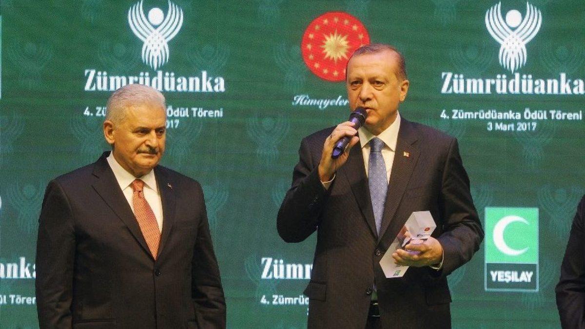 Yeşilay tarafından düzenlenen 4. Zümrüdüanka Ödül Töreni’nde Başbakan Binali Yıldırım, ‘Siyaset’ dalında layık görüldüğü ödülü Cumhurbaşkanı Recep Tayyip Erdoğan’ın elinden aldı.Yeşilay tarafından "Bağımlılıklardan uzak, sağlıklı yaşamı" misyon edinen, söz ve eylemleriyle bu mücadeleye destek veren kişi, kurum ve kuruluşlara verilen “Zümrüdüanka Ödülleri" için Cemal Reşit Rey Konser Salonu’nda tören düzenlendi.Yeşilay Genel Başkanı Prof. Dr. Mücahit Öztürk’ün ev sahipliğinde bu yıl dördüncüsü düzenlenen ödül törenine Cumhurbaşkanı Recep Tayyip Erdoğan, Başbakan Binali Yıldırım, Enerji ve Tabii Kaynaklar Bakanı Berat Albayrak, İstanbul Valisi Vasip Şahin, AK Parti İstanbul İl Başkanı Selim Temurci ve çok sayıda davetli katıldı.Törende Başbakan Binali Yıldırım, uyuşturucu ile mücadele konusundaki çalışmalardan dolayı ‘Siyaset’ dalında ödüle layık görüldü. Başbakan Yıldırım ödülünü Cumhurbaşkanı Recep Tayyip Erdoğan’ın elinden aldı.Ödülü takdim ederken kısa bir açıklama yapan Cumhurbaşkanı Erdoğan, “Sayın Başbakan’dan ricam olacak. O da üç köyümüzü muhtarlar sigara içilmeyen köy noktasına getirdikleri için teşekkür ediyorum. Sayın başbakanım o üç köye el atarlarsa o köyler 300- 400’e doğru tırmanır böylelikle” diye konuştu.Ödülü aldıktan sonra teşekkür konuşması yapan Başbakan Yıldırım ise, “Böyle bir ödüle layık görülmek benim için çok önemli. Hele bu ödülü Sayın Cumhurbaşkanımızın elinden almak ayrı bir anlam ifade ediyor. Sayın Cumhurbaşkanımızı her şeyi takdir eder. Onu belli etmez. Babam da bizi severdi ama sevdiğini belli etmezdi. Bu ödül bize ancak daha fazla azim verir daha fazla hizmet etmek adına teşvik eder. Her ne kadar Avrupa’ya göre 15-24 yaş arasında Avrupa’da uyuşturucu kullanımlarını oran yüzde 29.7 Türkiye de bu oran 2.7. Az olabilir. Ama biz istiyoruz ki hiç olmasın. Çünkü gençlerimiz geleceğimiz. Türkiye 2016 istatistiklerine göre Avrupa’da uyuşturucu yakalama ve bertaraf etme konusunda en önde deliyor. Bir seferinden 13 ton eroini yakalayarak, yüzde 16 dünya toplamında bir mücadeleyi ortaya koymuştur. Terörün en önemli kaynaklarından biri de uyuşturucu ticaretidir. Son aylarda yaptığımız operasyonlarda 4 milyar değerinde hint keneviri imha edildi. Bu konuda da PKK terör örgütüne darbe vuruldu” dedi.Gecede daha sonra toplu fotoğraf çekimi gerçekleştirildi.