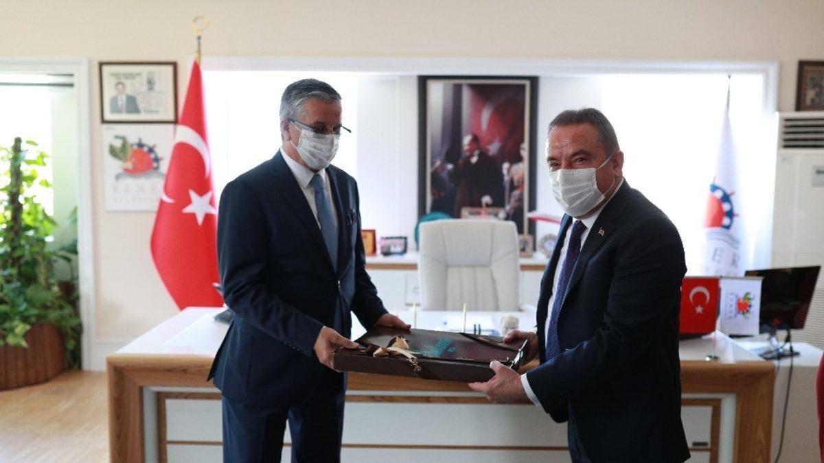 Antalya Büyükşehir Belediye Başkanı Muhittin Böcek, Kemer’de bir dizi ziyaretlerde bulundu. İlk ziyaretini Kemer Belediye Başkanı Necati Topaloğlu’na yaptı. Büyükşehir Belediyesi olarak yerli yabancı 23 milyon insana hizmet verdiklerini belirten Başkan Böcek, “Antalya önemli bir turizm kenti. Pandemi süreci ile zor günler geçirdik. Normalleşme süreci ile ilgili açıklanacak kararları bekliyoruz. 1 Hazirandan sonra alınacak kararlara göre neler yapacağız. İlçe belediyelerimizle, kamu kurum ve kuruluşlarımızla el ele verip çalışacağız. Önce can derdindeyiz. Halk sağlığımız çok önemli. Bu nedenle pandemi süresinde Antalya’da köşe bucak dezenfekte ve temizlik çalışması yaptık. İhtiyacı olan vatandaşımıza gıda yardımında bulunduk. Bu süreç sadece bizi değil tüm dünyayı etkiledi. Normalleşme süreci ile çalışmalarımıza devam edeceğiz. Kemer’e ne yapılması gerekiyorsa yapacağız” dedi.