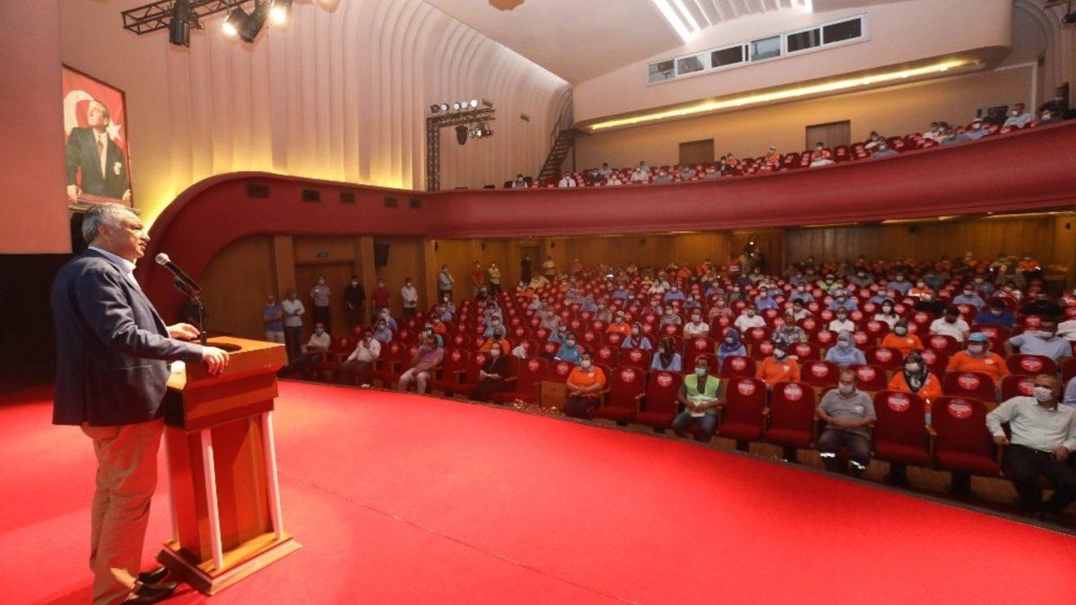 Büyükşehir ve ASKİ’ye bu ay toplam 21 milyon 600 bin lira para aktarıldığını belirten Başkan Zeydan Karalar, “Bizim çalışanımıza ödeyeceğimiz para ASKİ dahil 46 milyon lira. Bürokratlarımız memur maaşlarını ödemek zorunda olduğumuzu söyledi. Ben de ‘Memur maaşlarını ödemek zorundayız da, işçinin maaşını ödemek zorunda değil miyiz?’ dedim. Korona virüsle mücadele eden ve sahada yoğun çalışan işçimize maaş verilmemesine gönlüm asla razı olmaz. Şartları zorladık ve maaşlarımızı ödedik. Biz olanı paylaşmak zorundayız. İnsanlığın ve adaletin gereği budur. Biz çalışanın yanındayız. Bayram harçlığı-ikramiyesi geleneği başlattık. Maddi açıdan zor durumdayız ama devam ettiriyoruz. Ramazan Bayramı için de, korona virüsle mücadelede riske giren, sahada çalışan personelimize 750’şer lira verelim, büroda ve izinde olana da 500’er yüz lira verilim dedik ama, bunu 500’er yüz ve 300’er lira olarak biraz indirdik fakat vazgeçmedik. Paramız buna yetti. Olanı paylaşıyoruz. İnşallah Kurban Bayramı’na kadar gelirlerimiz eski düzeyine ulaşır ve bu miktarın biraz daha üzerine çıkarız. Bu belediye, siyasal parti ayrımı yapmadan, emek veren, çalışan işçisine değer verip sahip çıkacaktır” diye konuştu.