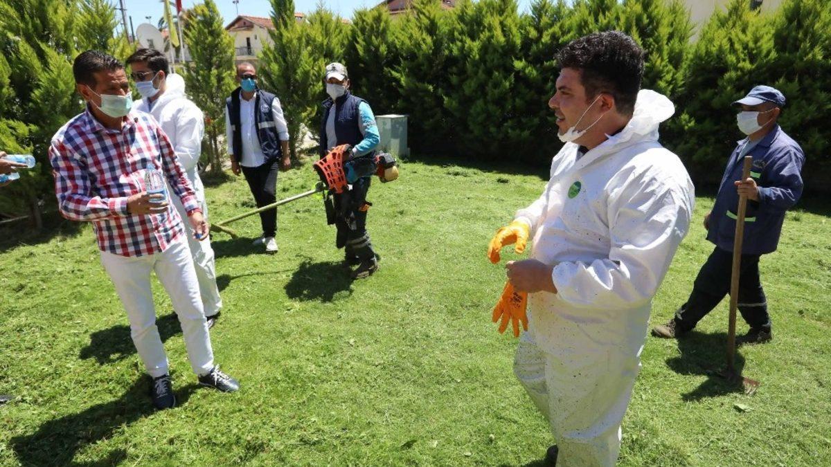 Başkan Kılıç’ın ilk durağı Park ve Bahçeler Müdürlüğü oldu. Yasak boyunca kentteki parkların bakımlarını yapan ekibin bayramını kutlayan Kılıç, parklarda yürütülen çalışmalarla ilgili bilgi aldı. Ziyaretin ardından Kılıç, tüm başkan yardımcılarıyla birlikte tulum ve siperliği giyerek sahaya çıktı. Başkan Kılıç ve belediye yönetimi, özel tulumlar giyip kosa makinelerini takarak İsmail Ağa Parkı’nda otları temizledi.