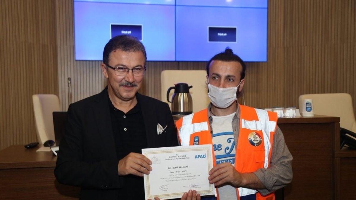 Temel Arama ve Kurtarma eğitimlerini başarıyla tamamlayan Eyüpsultan Belediyesi Fen İşleri Müdürlüğü bünyesinde bulunan Eyüp Sultan Afet Yönetim Birimi’nde (ESAY) görevli personel, sertifikalarını Eyüpsultan Belediye Başkanı Deniz Köken’den aldılar.