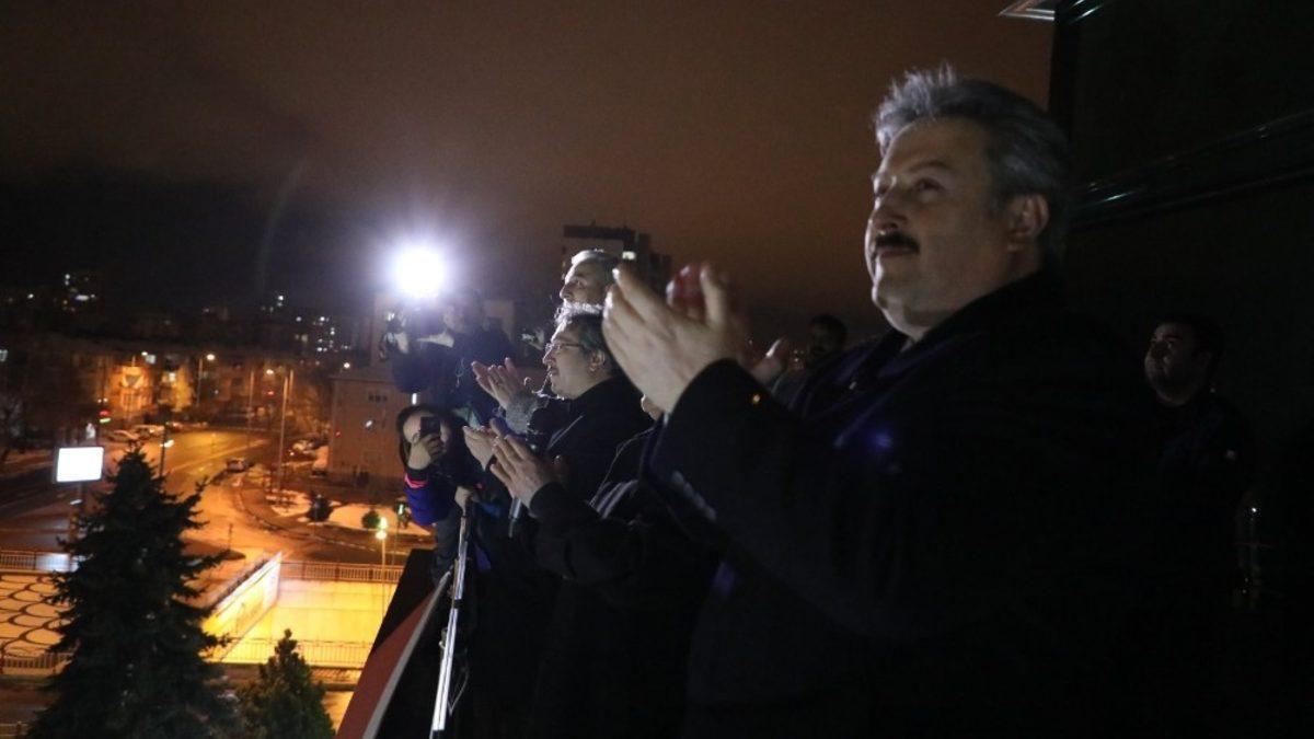 Melikgazi Belediye Başkanı Dr. Mustafa Palancıoğlu, Melikgazi Belediyesi balkonundan gece gündüz demeden koronavirüs salgını mücadelesi kapsamında fedakarca çalışan tüm sağlık çalışanlarına destek alkışında bulundu.