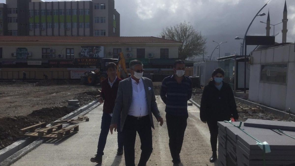Kemer Belediye Başkanı Necati Topaloğlu, Kemer Cumhuriyet Meydanındaki çalışmaları inceledi.