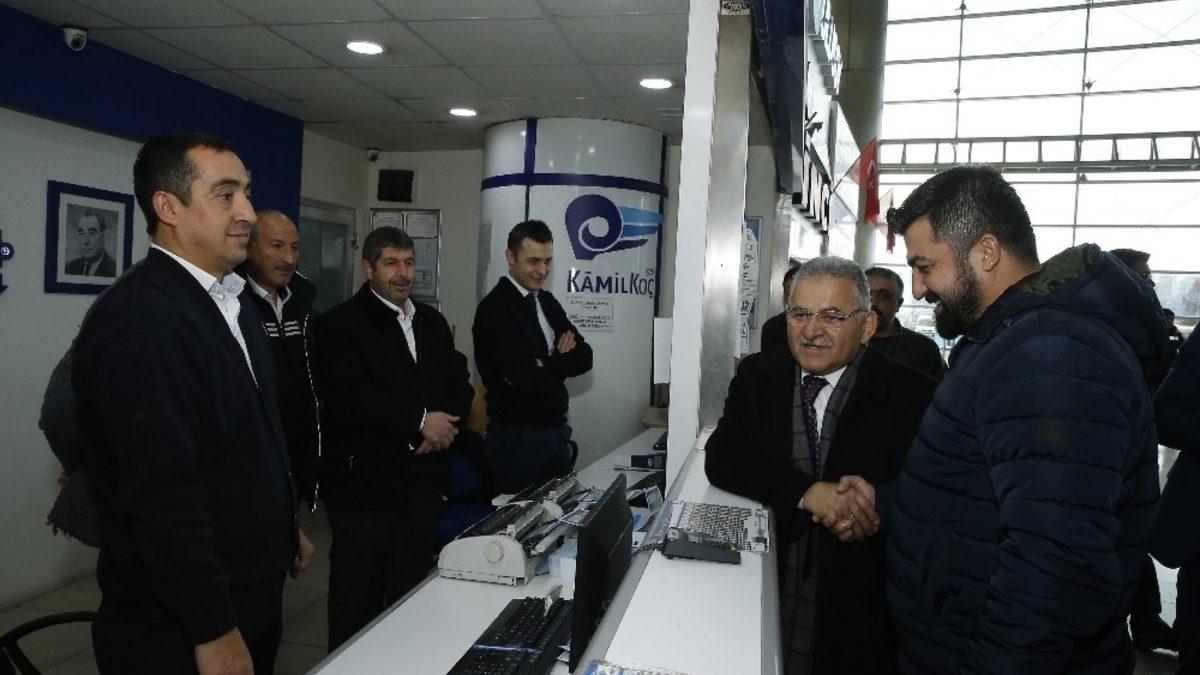 Büyükşehir Belediye Başkanı Büyükkılıç, Terminal ziyaretinde peronlarda hareket saatini bekleyen otobüslere de bindi. “Hayırlı Yolculuklar” temennisinde bulunan Başkan Memduh Büyükkılıç, yolcuların terminalle ilgili görüşlerini de aldı.