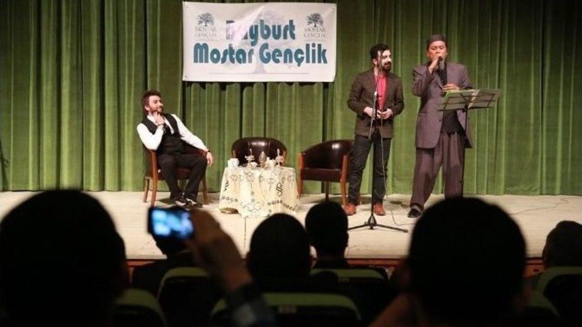 Bayburt Üniversitesi Tarih Kulübü ve Bayburt Mostar Gençlik tarafından Mostar Gençlik Muhabbet Buluşmaları gecesi düzenlendi.Şair Zihni Kültür Merkezinde düzenlenen geceye Şehit Osman Eğitim Bilim, Kültür ve Sanat Derneği Başkanı Abdullah Şağban, öğretmenler, çok sayıda üniversite öğrencisi ve vatandaşlar katıldı.Gecede saygı duruşunda bulunulmasından ve İstiklal Marşının okunmasından sonra Kur’an-ı Kerim ile açılış yapıldı.Programda radyo ve TV programcısı Mehmet Zeyd Yıldız ve Murat Göksen, ilahi sanatçısı Razif Abdulaziz Gani sahne aldı.Muhabbetle buluşmanın amaçlandığı gecede şiir Mehmet Zeyd Yıldız okuduğu şiirlerle Murat Göksen ise ezgilerle katılımcılara unutamayacakları bir gece yaşattı.Singapurlu ilahi sanatçısı Razif Abdulaziz Gani ise seslendirdiği İngilizce ve Türkçe ilahilerle geceye renk kattı.Şiir ve ezgi arlarında yapılan muhabbet sohbetleri ise büyük beğeni topladı.Gece sonunda Şehit Osman Eğitim Bilim, Kültür ve Sanat Derneği Başkanı Abdullah Şağban, TV programcısı Mehmet Zeyd Yıldız ve Murat Göksen ile ilahi sanatçısı Razif Abdulaziz Gani’ye gecenin anısına bir plaket takdim etti.
