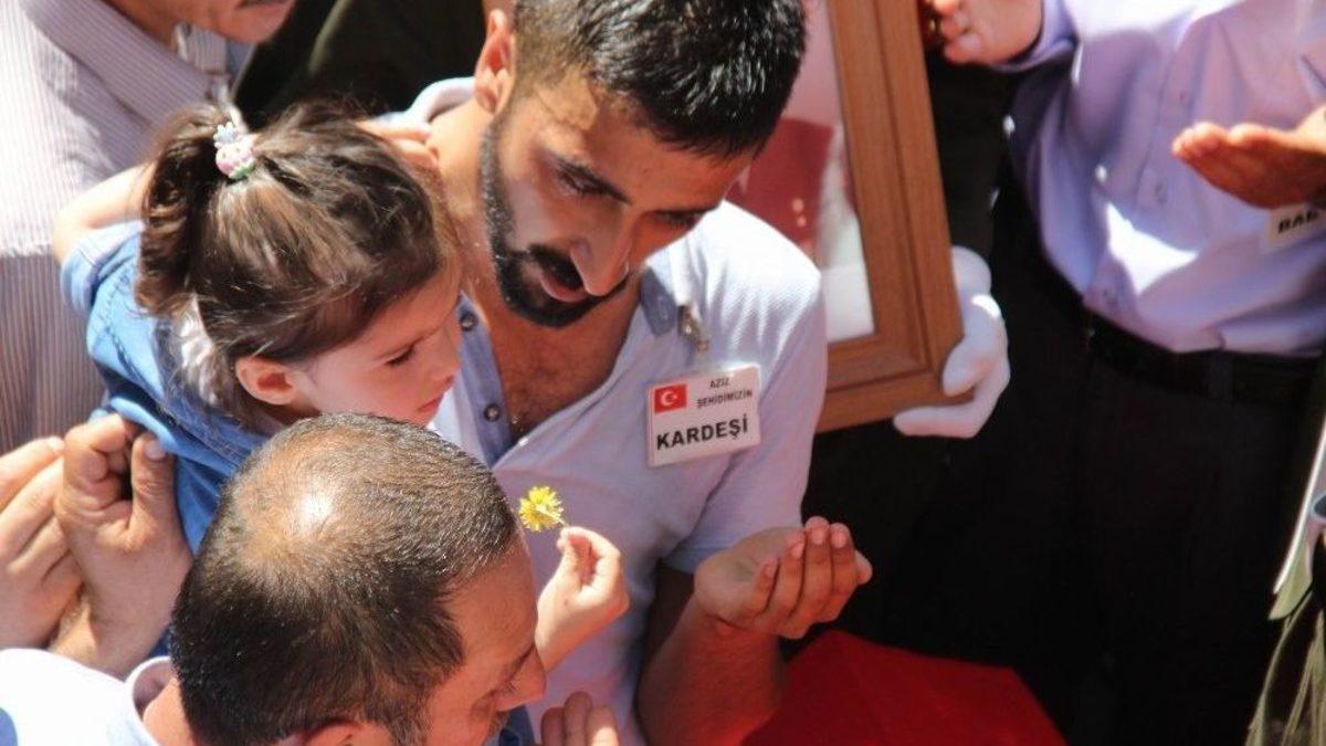 Bayramın 1. gününde babasız kalan 3 yaşındaki Miray Yahşi, şehit babasının tabutunu öperek onu son yolculuğuna uğurladı.Samsunlu Piyade Uzman Çavuş Mete Yahşi (28) bayramın 1. gününde görev yaptığı Hakkari’de terör örgütü tarafından açılan taciz ateşi sonucu vurularak şehit düşmüştü. Mete Yahşi’nin Samsun’un İlkadım ilçesi Kadıköy Mahallesi’ndeki baba evinde bugün helallik alındı.3 yaşındaki Miray, bayramda babasız kaldıHelallik sırasında şehidin 3 yaşındaki kızı Miray, amcasının kollarında babasının tabutunun başında ayrılmadı. Elinde bir çiçek ile babasının tabutu başında helallik alınmasını bekleyen Miray, zaman zaman tekbirlerden korkarak gözyaşlarına boğuldu. Bayramda babasız kalan şehit çocuğu Miray, babasının tabutu evin önünden giderken amcası tarafından tabut öptürülerek onu uğurladı.Şehit Mete Yahşi’nin cenazesi alınan helalliğin ardından cenaze namazının kılınması için tekbirler eşliğinde Büyük Cami’ye götürüldü. Burada cenaze namazının kılınmasını bekleyen şehit eşi Yasemin Yahşi’nin eşinin tabutuna son bakışı yürekleri dağladı. Şehidin görev arkadaşı da katıldığı cenaze töreninde arkadaşının tabutundaki fotoğrafı okşadı.Şehit Yahşi’nin cenazesi öğlen namazını müteakip kılanan cenaze namazının ardından son yolculuğuna uğurlandı.