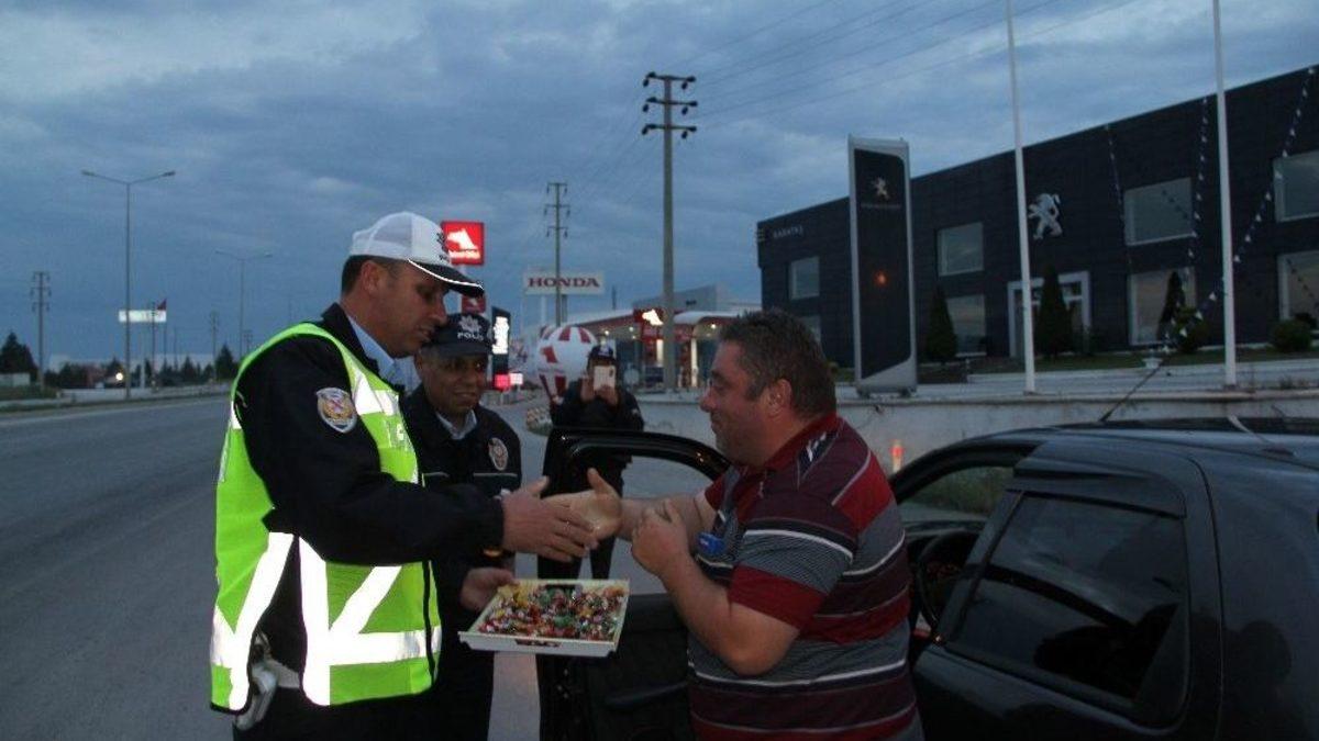 Çorum’da polis ekipleri, Ramazan Bayramı’nın ilk saatlerinde durdurdukları sürücülerin bayramını kutlayarak şeker ikram etti.Ramazan Bayramı dolayısıyla vatandaşların huzur ve güven içerisinde seyahat etmeleri için arefe gününden itibaren yoğun bir mesai harcayan polis ekipleri Ankara-Çorum karayolunda sabahın ilk ışıklarına kadar denetimlerini sürdürdü.Ankara karayolunda oluşturulan uygulama noktasında durdurulan sürücüler araçlarının evrakının kontrol edileceğini sanarken polis ekiplerinin bayram şekeri ikramını görünce şaşırdı. Bazı sürücüler şeker ikramının ardından polislere sarılarak bayramlarını kutladı.Denetimlerden duydukları memnuniyeti dile getiren sürücüler bu tür uygulamaların devam etmesini isterken yola çıkan sürücülerden trafik kurallarına uymaları için çağrıda bulundu.