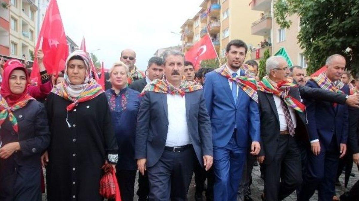Büyük Birlik Partisi (BBP) Genel Başkanı Mustafa Destici, Bilecik’in Söğüt ilçesinde Ertuğrulgazi’yi Anma ve Söğüt Şenlikleri’nde eğlencelerin iptal edilmesi sebebiyle düzenlenen mehteranlı yürüyüşe katılarak, Ertuğrul Gazi Türbesi’nde dua etti.Bu sene 734’üncüsü kutlanan Ertuğrulgazi’yi Anma ve Söğüt Şenlikleri’nin üçüncü gününde yapılan devlet büyüklerinin konuşmaları ve eğlencelerin iptal edilmesi sebebiyle BBP’liler alternatif etkinlik düzenledi. Sabah saat 09.30’da Söğüt Belediyesi önünde toplanan mehteran takımına eşlik eden BBP Genel Başkanı Mustafa Destici, grup ile yürüyerek Ertuğrulgazi Türbesi önüne geldi. Türbeyi ziyaret ederek dua eden Destici, daha sonra şenlik alanında kurulan bir çadırda okunan Kur’an-ı Kerim’i dinledi. Destici, çadır önünde toplanan kabalığa hitaben yaptığı konuşma, 734’üncüsü kutlanan Ertuğrulgazi’yi Anma ve Söğüt Şenlikleri vesilesi ile Ertuğrulgazi dedemizi ve onun neslini anma ve anlama programı için burada bulunduğunu söyledi. “Oğul boyundan suyundan olsun olmasın insanlara adil davran, adaletten ayrılma ki insanların birlik ve dirlik kazansın. Yurdunda obanda herkes gezsin, ululuk isteyen töreden ayrılmasın. Yüreğinden inancı, ağzından duayı, davranışlarından erdemi eksik etme. Birde sabırlı ol. Ekşi koruk sabırla üzüm olur’’ sözler ile Ertuğrulgazi’nin annesi Hayme Ana’yı anan Destici, sözlerine şöyle devam etti:“Onun sözleri bizim için de nasihattir. Bizlerinde inşallah Rabbim yüreğimizden imanı, ağzımızdan duayı ve davranışlarımızdan erdemi eksik etmesin. Sözlerime ’Bak oğul beni kır Şeyh Edebali’yi kırma. O bizim boyumuzun ışığıdır. Terazisi dirhem şaşmaz. Bana karşı gel, ona karşı gelme. Bana karşı gelirsen üzülür incinirim, ona karşı gelirsen gözlerim sana bakmaz, baksa da görmez olur. Sözümüz Edebali için değil senceğiz içindir’ diyen atam Ertuğrulgazi dedemin bu öğütleri de bizim için de bir nasihattir ve Şeyh Edebali bizim de ışığımızdır, bizim de büyüğümüzdür. Onun yolu bizim de yolumuzdur. ‘Ey oğul, beysin bundan sonra öfke bize uysallık sana, gücengenlik bize gönül almak sana, suçlamak bize katlanmak sana. Acizlik, yanlışlık bize hoşgörmek sana’ diyerek bizlere ışık olmuşlardır.”“TÜM ÖRF VE ADETLERİMİZİ, İSLAM AHLAK VE FAZİLETİMİZİ ASLA TERK ETMEYECEĞİZ”“Ertuğrul Gazi’nin torunu olduğumuzu, Osman Gazi’nin evlatları olduğumuzu, Osmanlı torunu olduğumuzu, Selçuklunun torunları olduğumuzu asla unutmayacağız” diyen Destici, “Allah’ın bir kulu olduğumuzu, Resulün ümmeti olduğumuzu asla unutmayacağız. Onun için de her işimizde Allah’ın rızasını belirteceğiz. Kuran’ı ve sünnetimizi kendimize ölçü olarak alacağız. Ehlisünnet çizgisinden asla ayrılmayacağız. Tüm örf ve adetlerimizi İslam ahlak ve faziletimizi asla terk etmeyeceğiz. Yani Türk İslam hükmümüzden asla canımızı vereceğiz fakat vazgeçmeyeceğiz. Ben şehitlerimizi rahmetle anıyorum. Tüm polis kardeşlerimize, polis camiamıza, ailelerine ve bu büyük Müslüman Türk kardeşlerime başsağlığı diliyorum. Rabbim mekanlarını cennet etsin. Ama şu hainlere de buradan Ertuğrulgazi ocağından kardeşlerimizin huzurundan şunları söylemek istiyorum. Şimdi bunların içerisinde cuma namazına gidenler var. Nasıl oluyor da peygamber ocağındaki Mehmetçikleri şehit ettikten sonra Allah’ın huzuruna çıkabiliyorsunuz. Mehmetçikleri şehit eden hainlerin, katillerin sözcülüğüne soyunanlar, imanla küfür bir arada bulunmaz. Yunus Emre ne diyor; ‘Bir kez gönül yıktın ise bu kıldığın namaz değil’ diyor. Bırakın gönül yıkmayı bunlar her gün bir ocağı söndürüyor. Bunlarınki hainlikten başka bir şey değil. Bunlarınki sahtekarlıktan başka bir şey değil. Bunlarınki ikiyüzlülükten başka bir şey değil. Bunların namazı münafıklıktan başka bir şey değil. Ey emperyalist küresel güçlerin uşağı sahte barışçı arkası PKK’ya dayananların yol arkadaşı Eş Başkan, sen İmralı’daki, Kandil’deki, Brüksel’deki efendiler şunu iyi bilsinler ki bu topraklarda İslam kardeşliğini yıkmalarına asla fırsat vermeyeceğiz. Ey sahte barışçı Eş Başkan sen ve İmralı’daki, Kandil’deki, Brüksel’deki efendiler şunları bilsinler ki bu topraklarda Türkmen-Kürt kavgası, kardeş kavgası çıkarmanıza müsaade etmeyeceğiz. Ey sahte Eş Başkan, sen İmralı’daki bebek katili, Kandil’deki yılanlar, Brüksel’deki efendilerin şunu bilsinler ki bu vatanı size böldürmeyeceğiz” dedi.Konuşmasından sonra Destici ve beraberindekiler Ertuğrulgazi’yi Anma ve Söğüt Şenlikleri kapsamında türbe etrafına kurulan Yörük çadırlarını gezdiler.