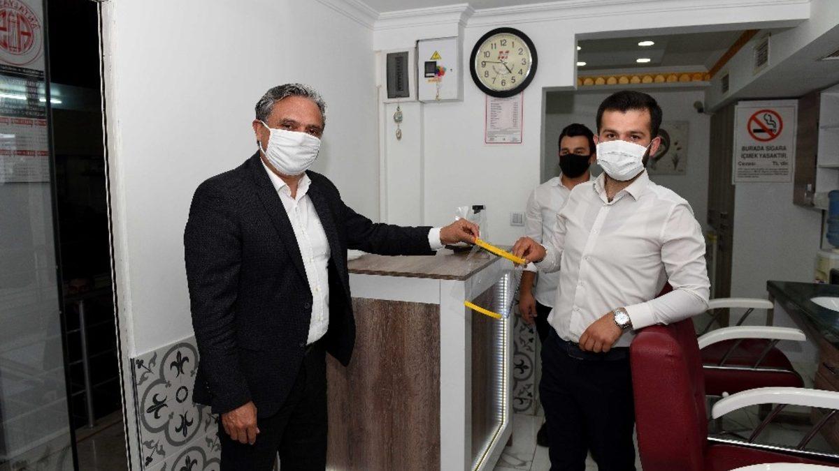 Antalya’da, Muratpaşa Belediye Başkanı Ümit Uysal, 11 Mart’ta yeniden kapılarını açacak berber ve kuaförlerin devam eden dezenfekte çalışmalarına eşlik etti ve esnafa yine belediyenin ürettiği yüz koruyucu siperlikli maskelerden dağıttı.