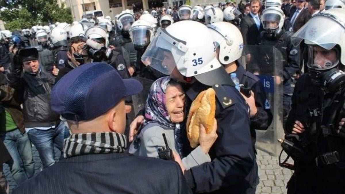 İzmir Büyükşehir Belediye Başkanı Aziz Kocaoğlu ve CHP milletvekillerinin destek verdiği Emek ve Demokrasi Güçleri tarafından yapılan Berkin Elvan protestosuna polis müdahale etti. Konak ilçesinde yürüyüş yapmak isteyen grubun ilerlemesi engellenirken, Aziz Kocaoğlu gazetecilere röportaj verdiği sırada gruba tazyikli su ve gazla müdahale edildi. Elinde ekmeği ile eyleme gelen bir teyze, "Hepsi bizim çocuğumuz" diyerek polise sarıldı.Gezi Parkı olayları sırasında kafasına gaz fişeği isabet etmesi sonucu 269 gün sonra hayatını kaybeden 15 yaşındaki Berkin Elvan için İzmir’de 2. gün de eylem yapıldı. Emek ve Demokrasi Güçleri tarafından yapılan eylemde, eylemci grup Konak’ta bulunan Saat Kulesi’ne yürümek istedi. Eylemci grup, çevik kuvvet ekipleri tarafından engellenirken, İzmir Büyükşehir Belediye Başkanı Aziz Kocaoğlu da dün gece çıkan olaylarda İzmir Büyükşehir Belediyesi İtfaiye Daire Başkanlığı tarafından TOMA’lara su takviyesi yapılmayacağına ilişkin yaptığı açıklama ile ilgili gazetecilere röportaj verdi. Röportaj sırasında eylemci grup Saat Kulesi’ne doğru ilerlemek isteyince polis gruba gaz ve tazyikli suyla müdahale etti. Olaylar sırasında CHP İzmir Milletvekili Mustafa Moroğlu da tazyikli su ve gaza maruz kaldı.SAAT KULESİ’NE BERKİN ELVAN AFİŞİPolis ve eylemcilerin çatışmasına dönüşen olaylarda, Konak ilçesi savaş alanına dönerken, müdahalenin ardından eylemciler Konak Saat Kulesi’ne doğru yürüyüşe geçti. Eylemciler, tarihi Saat Kulesi’ne, üzerinde Berkin Elvan’ın resminin bulunduğu afişi astı. Eyleme elinde ekmeği ile gelen yaşlı bir teyze, “Herkes bizim çocuklarımız ayırım yapmayın. Yazıktır günahtır. Hepsi bizim çocuğumuz. Polislerimiz de bizim çocuğumuz” diyerek polise sarıldı.