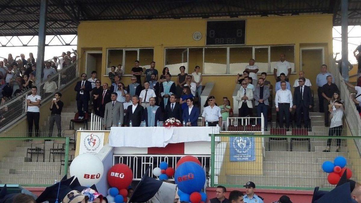 Zonguldak Bülent Ecevit Üniversitesi Çaycuma Meslek Yüksek Okulu ve Gökçebey Mithat-Mehmet Çanakçı Meslek Yüksek Okulu mezuniyet töreni gerçekleştirildi. Bu yıl 17’ncisi düzenlenen tören, Çaycuma Şehir Stadın da gerçekleştirildi. 2017-2018 Akademik Yılı Mezuniyet Töreniyle mezun binlerce öğrenci, diplomalarını görkemli bir törenle aldı.Törene; Çaycuma Kaymakamı Serkan Keçeli, Gökçebey Kaymakamı Ahmet Korkmaz, Çaycuma Belediye Başkanı Bülent Kantarcı, İlçe Jandarma Komutanı Ruhi Çevik, BEÜ Rektör Yrd. Prof.Dr. Kemal Büyükgüzel , Gökçebey Mithat-Mehmet Çanakçı Meslek Yüksekokulu Müdürü Yrd.Doç.Dr.Hasan Özer, Çaycuma Meslek Yüksek Okulu Müdürü Yrd.Doç.Dr. Hikmet Yazıcı, Mithat-Mehmet Çanakçı Meslek Yüksekokulu Güçlendirme ve Geliştirme Derneği Başkan Yardımcısı Kadir Çelik, İlçe Emniyet Müdürü Ahmet Kılıç, Çaycuma Yüksek Öğrenim Kurumlarını Destekleme Derneği Başkanı Hayri Kandemir, Perşembe Belediye Başkanı İsmail İnam, Çaycuma TSO Başkan Yardımcısı Serhat Dereli, ADD Çaycuma Şube Başkanı Zeki Saim Oral, Kent Konseyi Başkanı Berna Çimsalan Özyurt, daire müdürleri ve çok sayıda öğrenci velileri katıldı.Büyük Önder Gazi Mustafa Kemal Atatürk ve silah arkadaşları ile vatan uğruna ölen Mehmetçikler ve tüm maden şehitlerin aziz hatıralarına, saygı duruşu ve İstiklal Marşı’nın ardından törenin açılış konuşmalarına geçildi. Bülent Ecevit Üniversitesi Gökçebey Mithat-Mehmet Çanakçı Meslek Yüksekokulu 2017-20178 Akademik Yılı Mezunları adına Derya Kesgin, Çaycuma Meslek Yüksekokulu 2017-2018 Akademik Yılı Mezunları adına Salih Okul konuşma yaptı. Dereceye giren öğrencilerin konuşmalarının ardından Gökçebey Mithat-Mehmet Çanakçı Meslek Yüksekokulu Müdürü Yrd. Doç. Dr.Hasan Özer ve Çaycuma Meslek Yüksek Okulu Müdürü Yrd. Doç. Dr. Hikmet Yazıcı açılış konuşmalarını gerçekleştirdi.Gökçebey Mithat-Mehmet Çanakçı Meslek Yüksekokulu Müdürü Yrd. Doç. Dr. Hasan Özer; “Bugün evlatlarımız ülkemizin ve dünyanın çeşitli bölgelerinde üniversitemizi ve şeklimizi temsil edecekler. Onlara inanıyor ve güveniyoruz. Gökçebey ilçemiz ve Yüksek Okulumuz sahip olduğu imkanları yükseltmek, arzu ve gayretinde olan duyarlı insanlara sahiptir. Bu mutlu gün vesilesiyle kendilerine teşekkür etmek isterim. Toplumumuzda bu zamana kadar atılan başarılı imzalar adına daha önceki dönemlerde görev yapmış ve halen görev yapmakta olan tüm idari ve akademik personele içten teşekkürlerimi sunuyorum” dedi.BEÜ Çaycuma Meslek Yüksekokulu Müdürü Yrd.Doç.Dr. Hikmet Yazıcı mezunlarını tebrik ederek konuşmasını yaptı; “Gerçekleştirmeye çalıştığımız büyüme ve yeniden yapılanma sürecinde kaliteden ödün vermemekse önceliğimiz olmuştur. Bugüne kadar okulumuzda 5070 öğrencimiz mezun oldu ve kayıtlı 2216 öğrencimiz bulunmaktadır. Bugün 804 öğrencimizi mezun etmenin büyük gururunu ve onurunu yaşıyoruz. Sürekli gelişen dinamik bir yapıya sahip. Çaycuma Meslek Yüksek Okulu kendini yenileyen, büyüyen ve güzelleşen bir kampüs de bulunmaktadır. Öğrenim gören öğrencilerimizin mutluluğu ise bizleri son derece gururlandırmaktadır. Ayrıca büyük bir mutlulukla söylemek isterim ki Yüksek Okulumuzda dinamik, özgün ve katılımcı bir üniversite kimliğini ortaya koyan başarılı çalışmalar sürdürülürken, tüm çalışma arkadaşlarımı özverileri ile akademik ve sosyal sorumluluk çalışmaları ulusal ve uluslararası kongre, sempozyum ve çalışmak gibi bilimsel aktiviteler gerçekleştirilerek farkındalık yaratılmaktadır. Bu nedenle tüm çalışma arkadaşlarımı yürekten kutluyorum” dedi.Akabinde dereceye giren öğrencilere diploma ve hediyeleri protokol tarafından verildi. Hep bir arada keplerini havaya fırlatan öğrencilerin, duygu dolu anları yaşandı. Zonguldak Bülent Ecevit Üniversitesi Çaycuma Meslek Yüksek Okulu ve Gökçebey Mithat-Mehmet Çanakçı Meslek Yüksek Okulu mezunlarını vermenin mutluluğunu ve gururunu yaşadı.