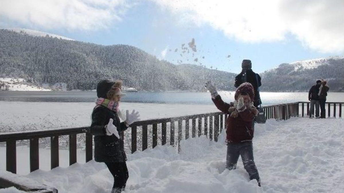 Bolu’nun doğal güzelliklerinden Abant Tabiat Parkı kar yağışıyla birlikte beyaz örtüyle kaplanırken, hafta sonlarını geçirmek için gelen tatilcilerin akınına uğradı.Bolu’da bir haftadır etkisini gösteren kar yağışı tüm kenti beyazlarla kapladı. Bolu’nun doğal güzelliklerinden olan Abant Tabiat Parkı da yoğun kar yağışıyla birlikte beyaz örtüyle kaplandı. Kar kalınlığının 50 santimetreye ulaştığı Abant Tabiat Parkı’nda hafta sonu tatillerini geçirmek için gelen tatilciler keyifli anlar yaşadılar. Hava sıcaklığının eksilerde olduğu Abant’ta gölün bir bölümü donarken, şehir dışından gelen öğrenciler ateş yakarak ısınmaya çalıştılar. Tatilcilerin bir kısmı göl etrafında faytonlarla tur atarken, bazıları da göl kenarındaki iskelede fotoğraf çektirmeyi tercih ettiler.