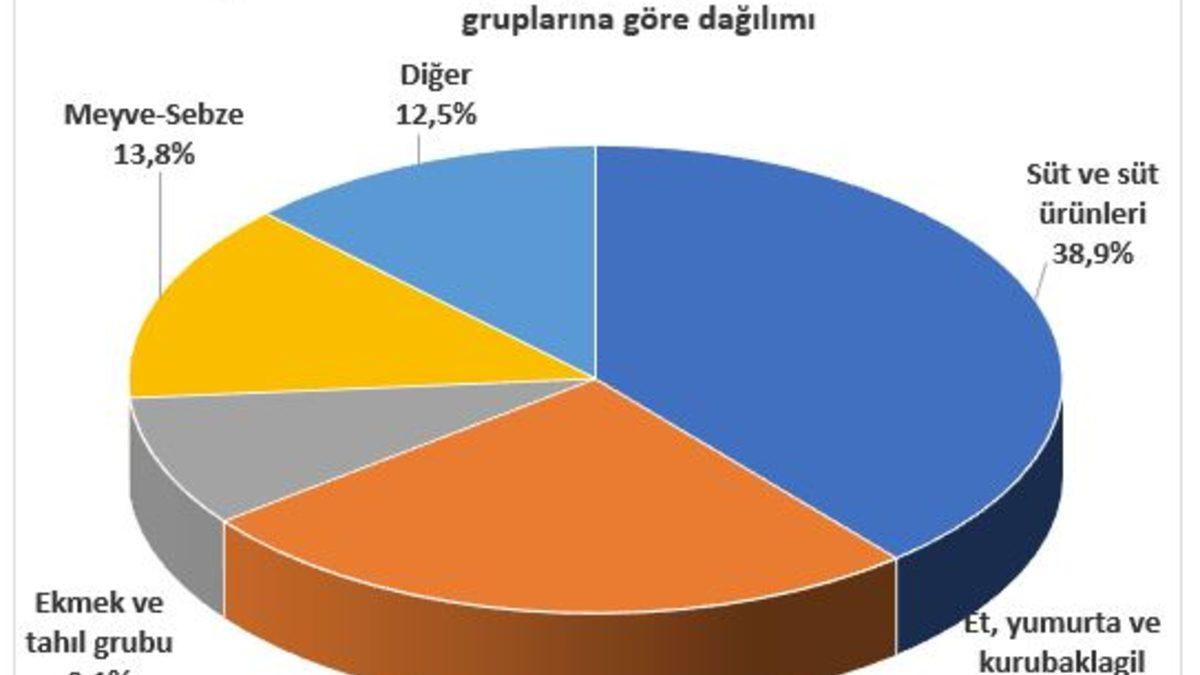 Daha dar bir gruplandırmaya göre harcamalarda süt ve süt ürünlerinin payı yüzde 38.2 ile en yüksek paya sahip. Sebze ve meyvenin harcamalar içindeki payı yüzde 14.1 oldu. Et, yumurta ve kurubaklagil grubunun payı yüzde 26.5 ile ikinci sırada. (Grafik - Tablo)