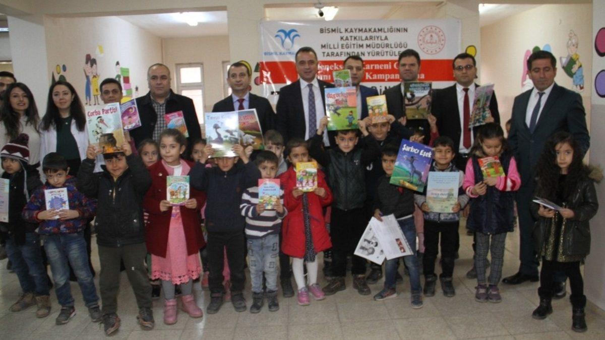 Diyarbakır’ın Bismil İlçe Belediye Başkanlığı ve İlçe Milli Eğitim Müdürlüğü işbirliği ile başlatılan karneni getir kitabını götür kampanyası kapsamında öğrencilere kitap dağıtıldı.