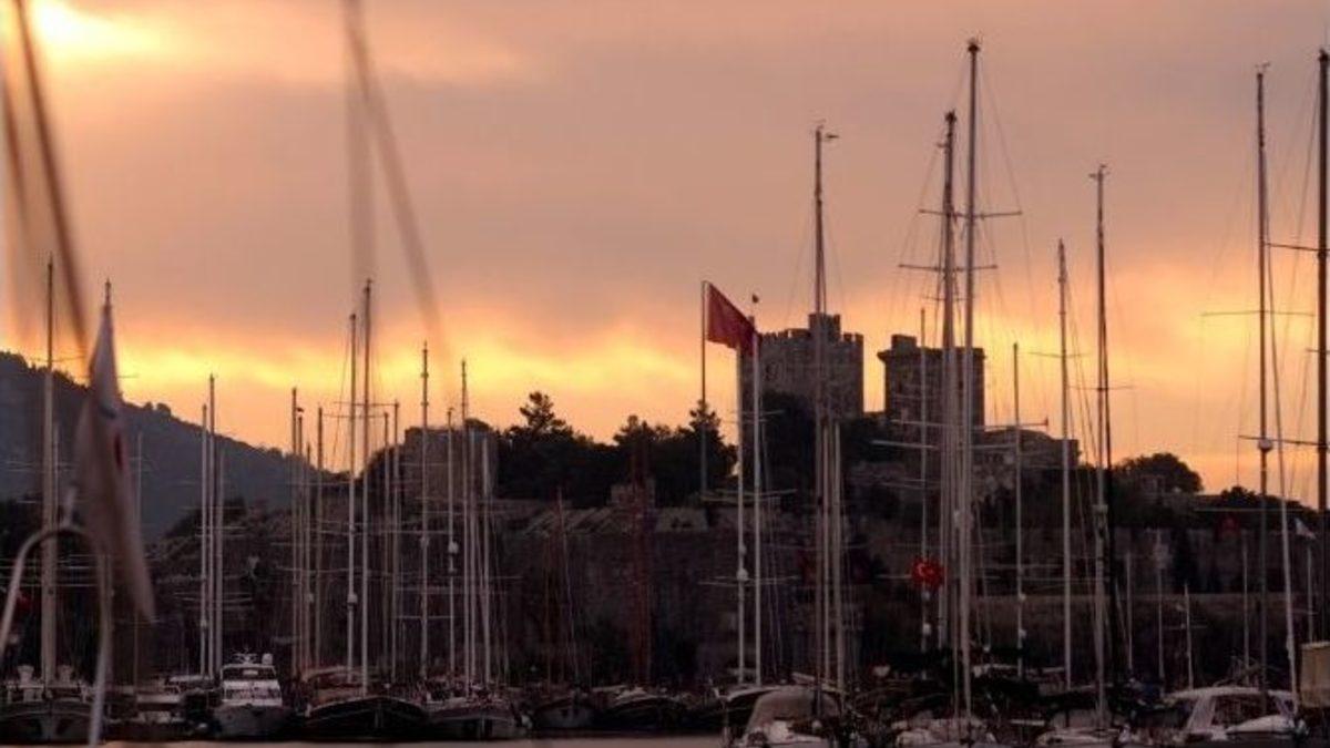 Muğla’nın Bodrum ilçesinde gündoğumunda oluşan renk cümbüşü izleyenleri büyülüyor.Gece ve gündüz sıcaklık farkının arttığı şu günlerde özellikle gündoğumunda ortaya çıkan renkler Bodrum’a farklı manzaralar katıyor. Sabah 6:30 ile 07:15 saatleri arasında mor, pembe, kırmızı ve altın sarısı renklerinin oluştuğu gökyüzü, Bodrum kalesi ve Bodrum açıklarında demirli Bodrum guletleriyle birleşince ortaya muhteşem manzaralar çıkıyor.Bodrum’da sabah yürüyüşüne çıkan vatandaşlar hemen hemen her gün farklı ve renkli bir manzarayla karşılaşırken, sabah yürüyüşü yapan Emrah Öztürk, her gün yaklaşık 5 kilometre yürüyüş ve koşu yaptığını belirterek, “Haftanın 5 günü sabahları yaklaşık 2 saat spor yapıyorum. Gökyüzü bana her gün farklı bir manzara sunuyor. Bazen çektiğim fotoğrafları Facebook’ta paylaşıyorum. Özellikle büyükşehirlerde yaşayan arkadaşlarım bu fotoğrafları çok beğeniyor” dedi.İlçede yaşanan gece gündüz sıcaklık farkı nedeniyle oluşan renk cümbüşünün yanında, Bodrum-Milas karayolu ve civarında birkaç gündür siste etkili oluyor. Sabah saatlerinde oluşan sis karayolunda ilerleyen araç sürücülerine zor anlar yaşatırken, zaman zaman maddi hasarlı trafik kazaları da meydana geliyor.Meteoroloji yetkililerinden alınan bilgiye göre Bodrum’da hava sıcaklıklarının 4-5 gün daha aynı şekilde olması tahmin edilirken, sabah saatlerin oluşan sis nedeniyle sürücülerin dikkatli olması istendi.