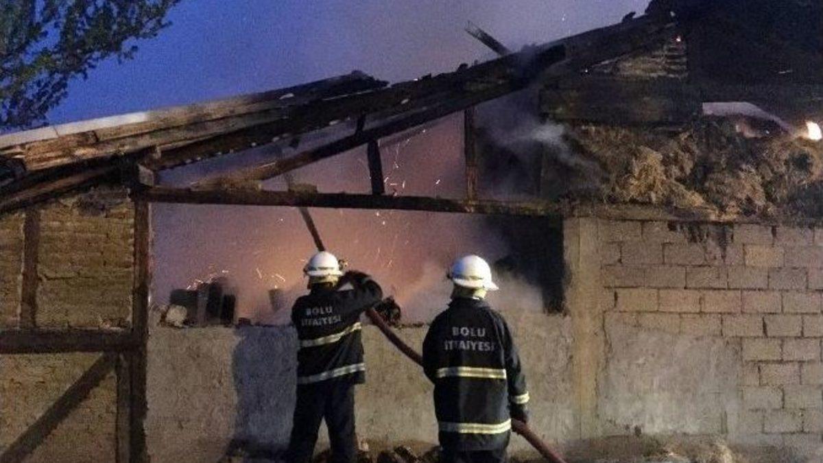 Bolu’da samanlıktan çıktığı iddia edilen yangında bir ev, odunluk, ahır ve samanlık yanarak kül oldu. Yangından son anda kurtarılan 3 büyükbaş hayvan kesilirken, 4 hayvan telef oldu.Edinilen bilgiye göre, yangın saat 04.45’de Ovadüzü Mahallesi 315. Sokak’ta meydana geldi. İddiaya göre, Sabri Demir ve Ayhan Demir’e ait samanlıkta bilinmeyen nedenle yangın çıktı. Alevler bir anda samanlığı sararken, yangın hemen bitişiğindeki ev, odunluk ve ahıra sıçradı. Evde yaşayanlar korku içinde kendilerini dışarıya attı. Olay yerine gelen Bolu Belediyesi İtfaiye Müdürlüğü’ne bağlı 5 itfaiye aracı alevlere müdahale etti. Mahalle sakinleri olay yerine akın ederek çalışmalara yardımcı oldular. İtfaiye ekiplerinin yaklaşık 3 saat süren çalışması sonrasında samanlıktaki yangın kontrol altına alındı.Ahırda bulunan 3 büyükbaş hayvan telef olmak üzereyken kesilirken, 4 hayvan alevlerin arasında çıkartılamayarak telef oldu. Hayvanlar traktör yardımıyla ahırdan çıkartıldı. Evde yaşayanlar sinir krizleri geçirirken, 3 kişi dumandan etkilendi. 112 sağlık ekipleri tarafından tedavileri yapılan 3 kişinin sağlık durumlarının iyi olduğu ifade edildi. Polis ekipleri yangınla ilgili inceleme başlattı.