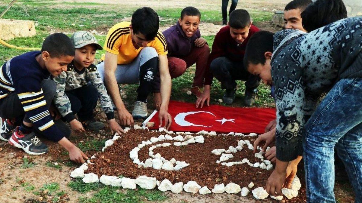 Suriye sınırına sıfır noktadaki Hatay’ın Oğulpınar Mahallesi’nde yaşayan çocuklar, Afrin’e atılan roket ve obüs mermilerinin altında korkusuzca oyun oynayarak yaşamını sürdürüyor. En büyük güven kaynağı olarak gördükleri Türk askerlerini sınır geçişlerinde tezahüratlarla karşılayan çocuklar, taşlarla Türk bayrağı yaparak vatan sevgilerini askerlere gösteriyorlar.Zeytin Dalı Harekatı’nın 25. gününde Türk Silahlı Kuvvetleri ile Özgür Suriye Ordusu birlikleri Afrin’deki ilerleyişini sürdürürken, Hatay’ın sınıra sıfır noktasında yer alan Hassa, Kırıkhan ve Reyhanlı ilçelerindeki sınır karakollarından da çok namlulu roket atar ve fırtına obüsleri de terör örgütü PKK/YPG-PYD hedeflerini vurmaya devam ediyor.Reyhanlı ilçesinin sınıra sıfır noktasındaki Oğulpınar Mahallesi’nde yaşayan çocuklar da karakoldan atılan roket ve bomba seslerinden artık korkmadıklarını, eskiden olduğu gibi okula gidip, oyunlar oynadıklarını bildirdi.Ailesine ait hayvanların çobanlığını yapan 17 yaşındaki Kamil Şanverdi, Türk askerinin Afrin’e müdahalesinden önce teröristlerin ilçedeki sivillere roketlerle saldırdığını hatırlatarak, “Eskiden buralara daha çok roket düşüyordu. Askerler geldikten sonra kendimi daha güvende hissediyorum. Buradan top atışlarını duyuyoruz. Sınıra yakın yerlerde hayvanlarımızı otlatıyoruz ama korkmuyoruz. Askerin hep arkasındayız, destekçileriyiz. Beni de askere şimdi götürseler giderim” diye konuştu.Asker kamuflajı ve şapkası takan Mehmet Şanverdi (8) ise kum ve toprakla yaptıkları Türk Bayrağı ile harekata katılacak olan askerleri karşıladıklarını kaydederek, “Onlar düşmanı vuruyorlar” dedi.Ahmet Şanverdi (11) de eskiden kum ve taşla ’horoz’ adını verdikleri oyunu oynadıklarını şimdi ise askere sevgilerini göstermek için Türk bayrağı hazırladıklarını söyledi.