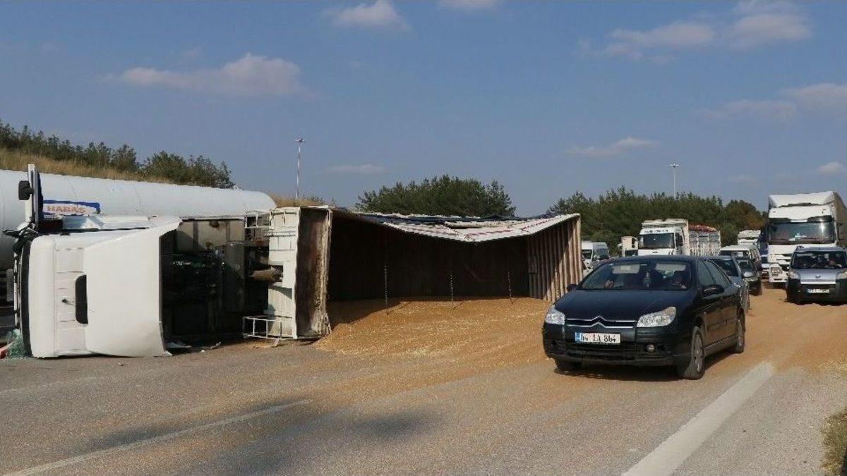 Adana’da tonlarca buğday yüklü tır otoyolda devrildi. Kaza nedeniyle otoyolda uzun araç kuyrukları oluştu, bazı araçlar buğdaylara saptanıp yolda mahsur kaldı.Kaza, Tarsus-Adana-Gaziantep (TAG) otoyolu Adana istikameti Misis Kavşağı’nda meydana geldi. İddiaya göre, Cemal Eren yönetimindeki 47 KG 197 plakalı tonlarca buğday yüklü tır virajı alamayıp devrildi. Kazayı gören vatandaşlar durumu polis ve sağlık ekiplerine bildirdi. Olay yerine gelen 112 sağlık ekipleri tır içerisinde sıkışan sürücüyü sıkıştığı yerden kurtarıp Adana Numune Eğitim ve Araştırma Hastanesi’ne kaldırdı.Tonlarca buğday yüklü tırın otoyola devrilmesi nedeniyle ise otoyolda uzun kuyruklar oluştu ve yerdeki buğdaylar nedeniyle bazı araçlar ilerlemekte güçlük çekti. Hastaneye kaldırılan tır sürücüsünün durumunun iyi olduğu öğrenildi. Kazayla ilgili soruşturma başlatılırken tır otoyoldan kaldırıldı ve temizlik çalışmaları başlatıldı.