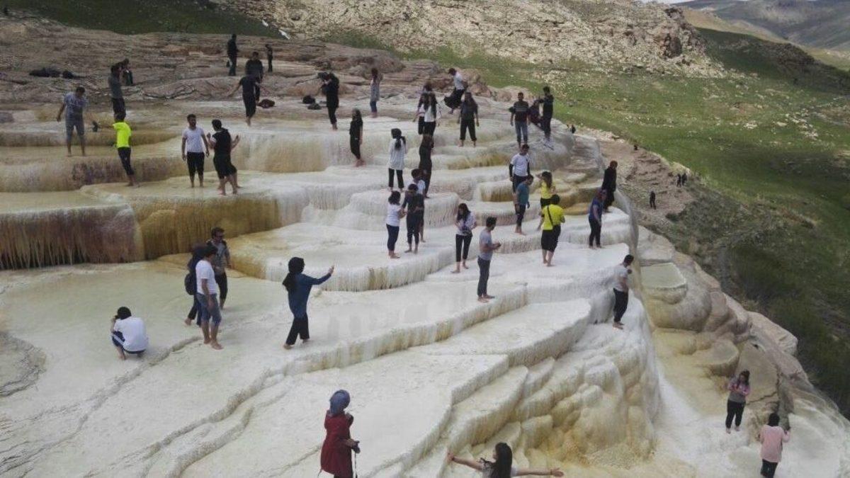 Van’ın Başkale ilçesinde bulunan ve görüntüsüyle Pamukkale’yi andıran travertenler, havaların ısınmasıyla birlikte ziyaretçi akınına uğruyor.Van’a 145, Başkale’ye 35 kilometre uzaklıktaki Dereiçi mahallesi sınırları içerisinde bulunan travertenler, doğa harikası görüntüsü ve Denizli’deki Pamukkale’ye benzerliğiyle ilgi çekiyor. Havaların ısınması ile beraber, Vadi Doğa Sporları Kulübü Başkanı Ömer Demez, yönetiminde yaklaşık 130 kişilik doğa sever, travertenlere gezi düzenlendi. Van’ın gizli kalmış güzellikleri hem ziyaret edip hem de fotoğraflarını çekerek takipçileri ile paylaşıp bölgeye yerli ve yabancı turistleri çekmeye çalışıyorlar.Ziyaretle ilgili açıklama yapan Vadi Doğa Sporları Kulübü Başkanı Ömer Demez, "Vadi Doğa Spor Kulübü olarak bugün etkinliğimizi 119 kişi ve 8 kaptanla Başkale’deki travertenlerde yaptık. Güzel bir yer. Saklı şelaleyi gezdik. Şuan anda arkamızda travertenler var. Birazdan oraya geçeceğiz. Güzel bir bölge, ama sahipsiz bir yer. Doğa bizsiz yaşayabiliyor ama biz doğa olmadan yaşayamayız. Maalesef insanoğlunun gittiği bütün yerleri kirletmiş. Doğayı yok ediyoruz. Keşke olmasa, tek istediğimiz insanların doğayı koruması. Bu geleceğimiz içindir. Bana göre 3 kesim insan doğayı yok ediyor. Biri avcılar, birisi defineciler ve birde pikniğe gidip piknik yaptıktan sonra çöp bırakanlar. Keşke onlar da olmasa güzel bir doğa olacak" dedi.Bu hafta bilinmeyen saklı şelale ve Pamukkale’yi aratmayan Başkale Dereiçi (sıkans) Mahallesi travertenlerine etkinlik düzenlediklerini ifade eden Demez, "Etkiliğe yaklaşık 130 kişi katıldı. Amacımız insanları şehir stresinden uzaklaştırıp doğayla buluşturmak. Ve doğayı koruma bilinci beraber yaşam, yeni dostluklar kurmak. Doğa zenginliklerini tanıtmak, özellikle çocukları bu çalışmalara yönlendirmek için farkındalık oluşturuyoruz. Etkinliğimiz sabah saat 07:00’da toplanma ve 07:30’da hareket ettik. Başkale ilçe çıkışında yolun sol tarafında bulunan tarihi Kelekom Köprüsünde kahvaltı yaptıktan sonra yolculuğumuz Dereiçi (sıkans) Mahallesi travertenlerine devam ettik. Van Başkale Dereiçi köyü travertenleri arası 145 kilometre bir yol. Van-Hakkari karayolundan travertenlere kadar olan 15 kilometre topraklı bir yol asfalt yapılmamış bu sıkıntı yaşatıyor. Bir de travertenler koruma altında olmadığı içi o doğa harikası yok olma tehlikesi altında. Sit alanı ilan edilmeli. Bakım yapılmalı, yol yapılmalı ve resmi kurum kuruluşlarca tanıtımı yapılmalı. İl Kültür ve Turizm Müdürlüğü, Van Büyükşehir Belediyesi, Gençlik Hizmetleri ve Spor İl Müdürlüğüne büyük iş düşüyor diye düşünüyoruz. Büyük bir zenginlik ama biz sahip çıkmayı bilmiyoruz. Bu doğa harikası yapı yok olmadan sahip çıkmamız gerekiyor hepimize iş düşüyor. Hem turizm den şikayet ediyoruz hemde turizm için çaba harcamıyoruz. Bu bölgede turizme yönelik çalışmalar yapılmalı, bölge çok zengin bir konuma sahip. Van doğa bakımından bütün Türkiye’yi bünyesinde barındırıyor. Bir Ege, Marmara Karadeniz İç Anadolu ve daha fazlası var. Ama bütün bu bölgelerde Van yok. Van’da, Karadeniz doğası var. Ege sahilleri var, peribacaları, travertenler, rafting için dereler, her yeri yamaç paraşüt için uygun, vahşi bakir doğa kısacası ne isterse insan bulabilir bu şehirde. Bütün doğaseverleri Van’ımıza bölgenize davet ediyoruz. Emin olun çok güvenli ve muhteşem bir coğrafya. Etkinliğe katılan bütün doğasever dostlarımızı kutluyoruz Doğada buluşalım” şeklinde konuştu.