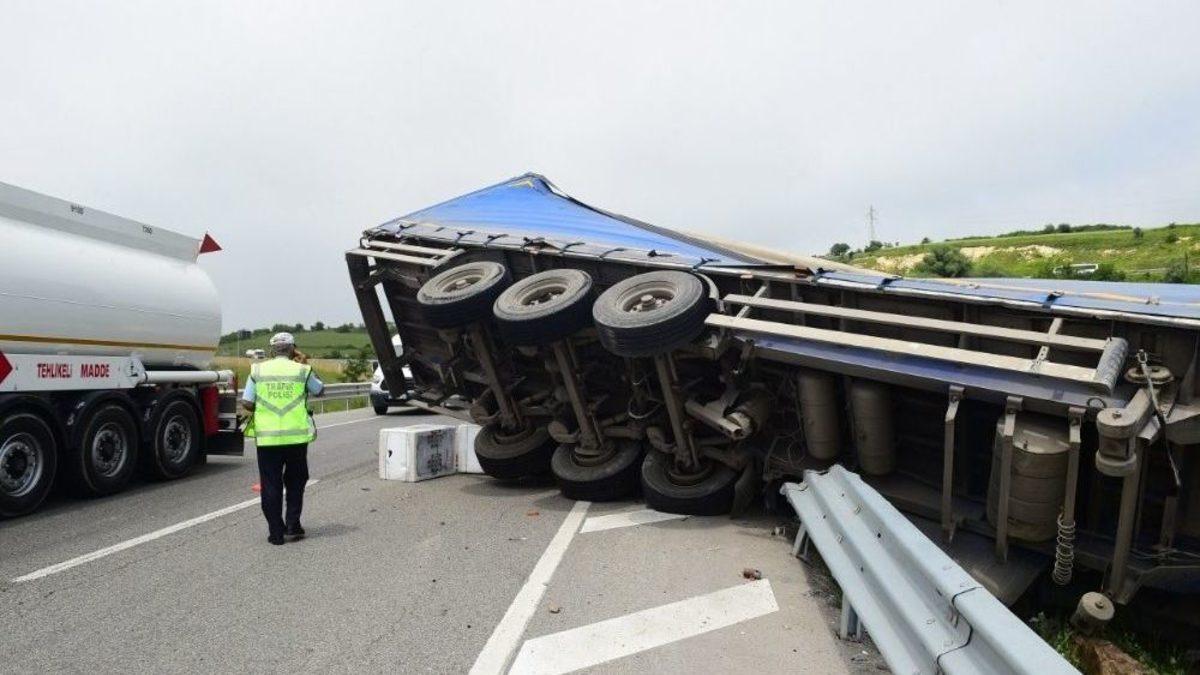 İstanbul-Bursa kara yolu Güneyköy yakınlarındaki keskin virajda meydana gelen trafik kazasında, çamaşır makinesi yüklü bir TIR devrildi. Kazada onlarca çamaşır makinesi hurdaya dönerken, TIR sürücüsü ise yaralandı.Kaza, İstanbul-Bursa karayolu, Yalova Güneyköy yakınlarında bulunan ve sık sık trafik kazalarının yaşandığı keskin virajda meydana geldi. Edinilen bilgiye göre, Kocaeli’deki bir beyaz eşya fabrikasından yüklediği çamaşır makinelerini Bursa’ya götürmek üzere yola çıkan Taner Yorulmaz (50) idaresindeki 41 L 0521 plakalı bir TIR, Yalova-Orhangazi karayolu, Güneyköy yakınlarındaki keskin virajda kontrolden çıktı. Bariyerleri aşan TIR yan yattı. Hurdaya dönen TIR’ın sürücüsü Taner Yorulmaz, çevredeki vatandaşlar tarafından araçtan çıkarılarak olay yerine çağrılan ambulansa taşındı. Yalova Devlet Hastanesine kaldırılan yaralı TIR sürücüsünün sağlık durumunun iyi olduğu belirlendi.Onlarca çamaşır makinesi hurdaya döndüFabrikadan çıkan ve Bursa’ya götürülmek istenen TIR’daki onlarca çamaşır makineleri ise kaza sonrasında hurdaya döndü. Kaza sebebiyle Yalova-Bursa karayolunda kazanın olduğu bölgede trafik akışı kontrollü geçişle sağlanırken, firma ile irtibata geçen polis ekipleri olay yerine bir başka araç çağırdı. Kaza yapan araçtaki çamaşır makineleri başka bir araca taşındıktan sonra kaza yapan TIR bulunduğu yerden kaldırılacak. Polis ve jandarma ekipleri kaza ile ilgili soruşturma başlattı.Kazalar hep aynı bölgedeÖte yandan çamaşır makinesi yüklü TIR’ın kaza yaptığı bölge kara nokta olarak biliniyor. Keskin bir viraj olan bölgede alınan tüm tedbirler ve uyarı levhalarına rağmen sık sık trafik kazası yaşanıyor.