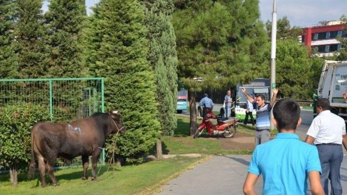 Bursa’da kesilmeye götürülürken sahibinin elinden kurtulan kurbanlık boğa, Bursa sokaklarını birbirine kattı. İstanbul yolu Beşyol Kavşağı’ndan kent meydanına kadar kaçan boğa, uzun uğraşlar sonucu yakalanabildi.Sabah saat 09.00 sıralarında Beşyol mevkiinde kesilmeye götürülürken sahibinin elinden kurtulup kaçmaya başlayan kurbanlık boğa, önce İstanbul yolu üzerine çıkıp ters istikametten şehir merkezine doğru koşmaya başladı. Yaklaşık 2 kilometrelik yolu koşan boğa, kent meydanı arkasındaki yeşillik alana girdi. Boğayı peşinden takip eden polis ekipleri ve vatandaşlar yeşillik alanın etrafını çevirdi. İhbar üzerine olay yerine gelen Osmangazi Belediyesi Zabıta Müdürlüğü bünyesinde görev yapan boğa yakalama timi, kaçan boğayı bayıltmak için uyuşturucu iğne attı. Atılan iki iğneye rağmen bayılmayıp daha da hırçınlaşan boğa, vatandaşların yakalamak için üzerine attığı iplerden sıyrılıp kent meydanına doğru koşmaya başladı. Bayram hareketliliğinin yaşandığı kent meydanında aniden karşılarına çıkan kızgın boğayı gören vatandaşlar adeta kaçacak delik aradılar. İspanya sokaklarını aratmayan görüntülerin yaşandığı kent meydanında bir ara polis noktasına da girmeye çalışan boğa, camı kıramayınca geri döndü. Bu sırada bir vatandaş kaçarken ayağı takılıp sendeleyen boğanın ipini son anda yakalayınca boğa timlerinin de yardımıyla öfkeli hayvan etkisiz hale getirildi. Çok sayıda kişi tarafından sürüklenerek götürülmeye çalışılan boğa, güçlükle kamyonete bindirildi. Kent meydanındaki vatandaşlar da rahat bir nefes aldı.