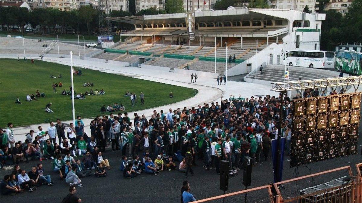 Bursasporlu taraftarlar, basketbol takımlarının cezası sebebiyle seyircisiz oynadığı karşılaşmayı salon yanında kurulan dev ekranda coşkuyla takip etti.Türkiye Basketbol Ligi’nde ilk 8’e giren takımların karşı karşıya geldiği Play-Off Çeyrek Final müsabakaları başladı. Normal sezonu 4. sırada tamamlayan Bursaspor basketbol takımı, bugün saat 19.00’da Afyon Belediyespor’u Atatürk Spor Salonu’nda konuk ediyor. Yeşil-beyazlı kulübün cezası sebebiyle seyircisiz oynanan müsabaka kulüp televizyonundan naklen yayınlanıyor. Canlı olarak yayınlanan mücadele için Bursasporlu taraftarlar da spor salonunun yanında bulunan Bursa Atatürk Stadyumu’nda Bursa Büyükşehir Belediyesi Kültür A.Ş. tarafından kurulan dev ekranda karşılaşmayı coşkuyla takip etti. Atatürk Spor Salonu’nun hemen yanında yaktıkları meşaleler ve tezahüratlarıyla takımlarına destek olan yeşil-beyazlı taraftarlar, renkli görüntüler de sergiledi.