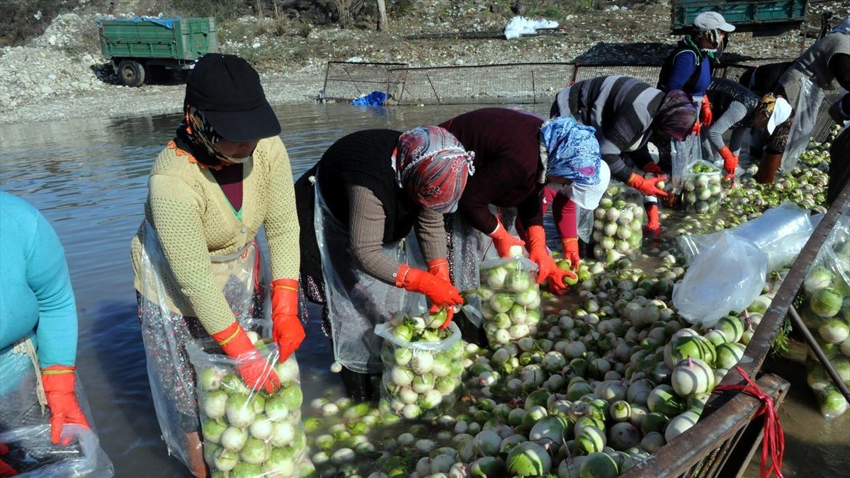 Tarladan toplanan turplar, Savrun Çayı'nda kurulan havuzlara getirilerek üzerilerindeki topraktan arındırılıp paketleniyor.
